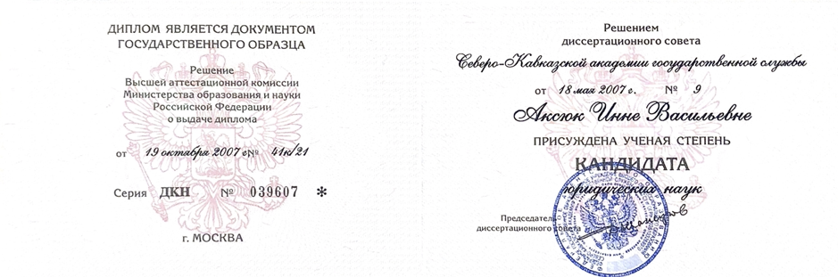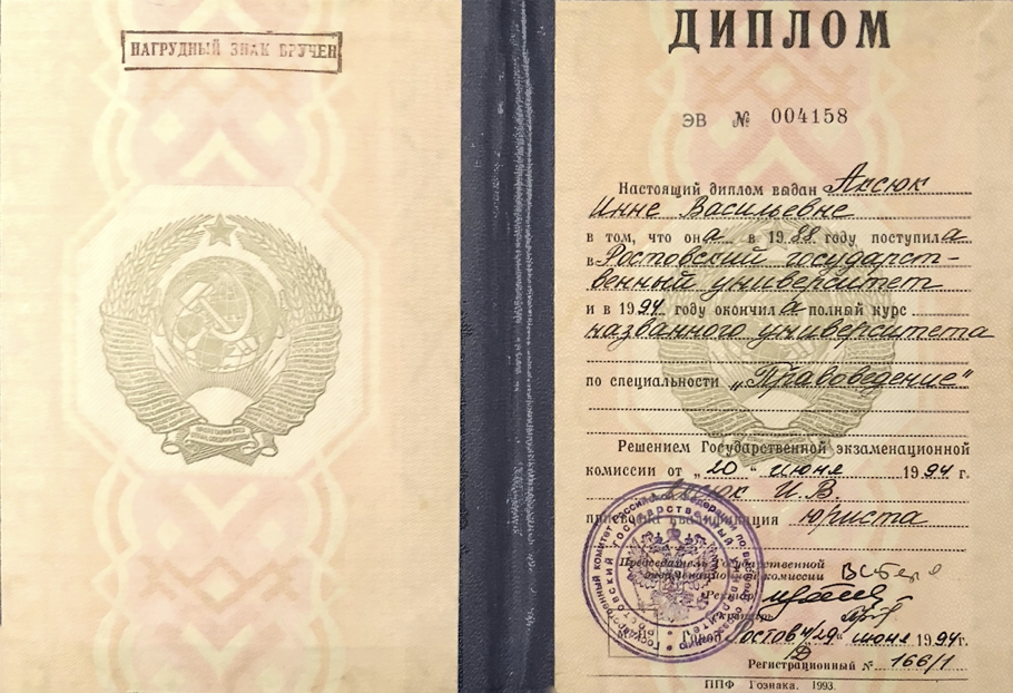 Образование: Высшее образование, Ростовский Государственный Университет, "Правоведение", юрист, специалист, 1994 год.