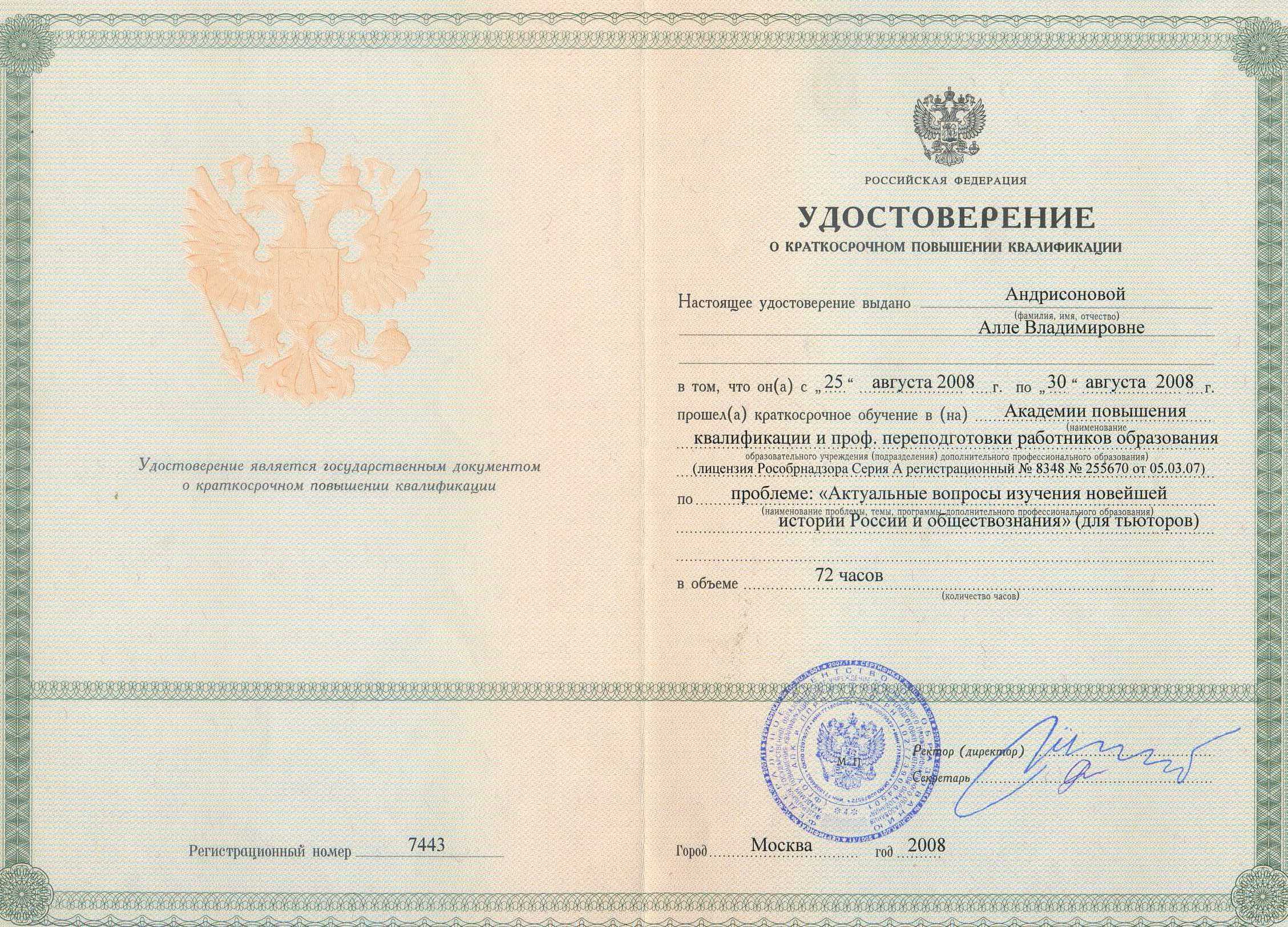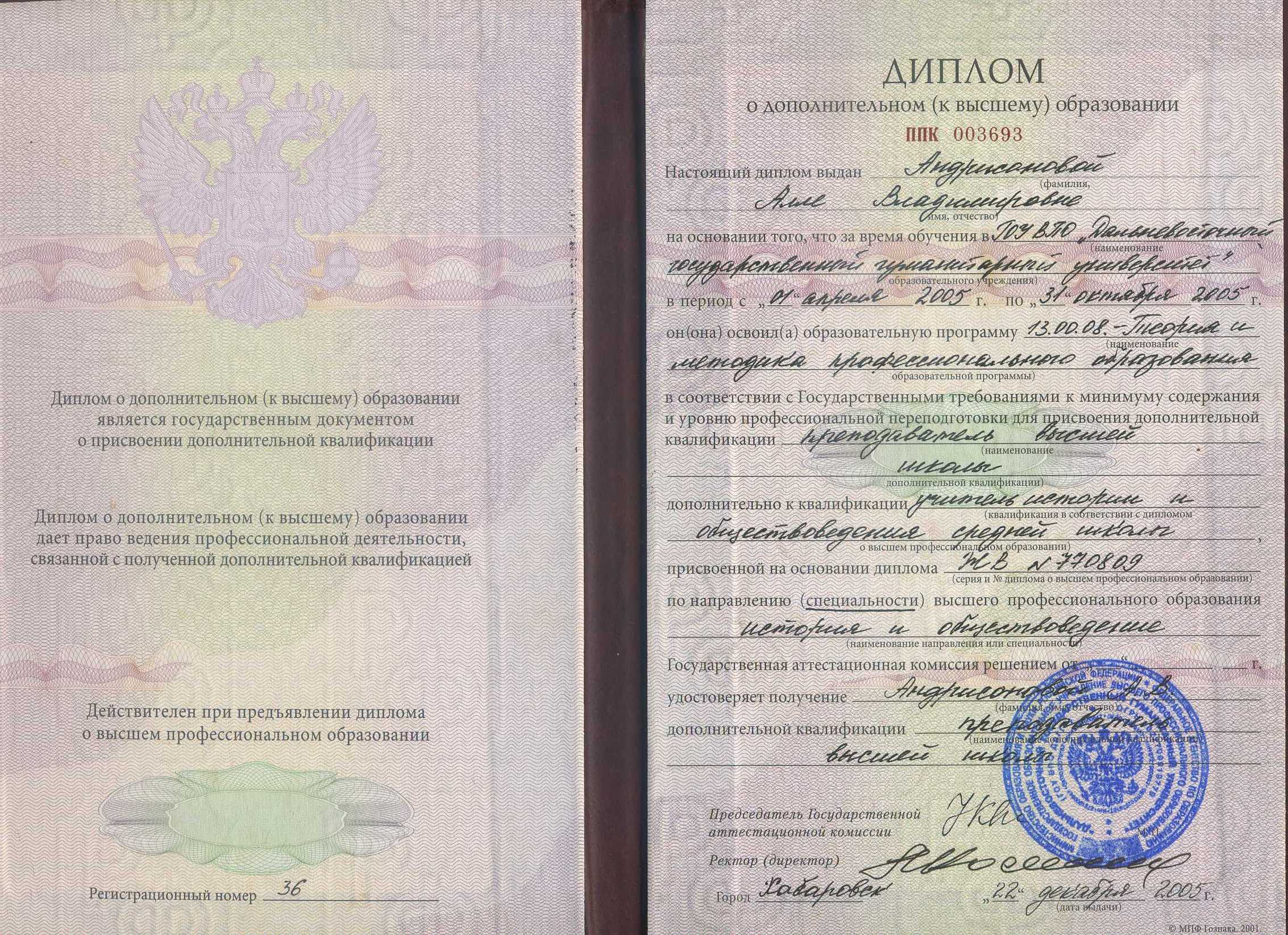 Дальневосточный Гуманитарный Университет, преподаватель высшей школы по направлению "История и обществознание", 2005 год.
