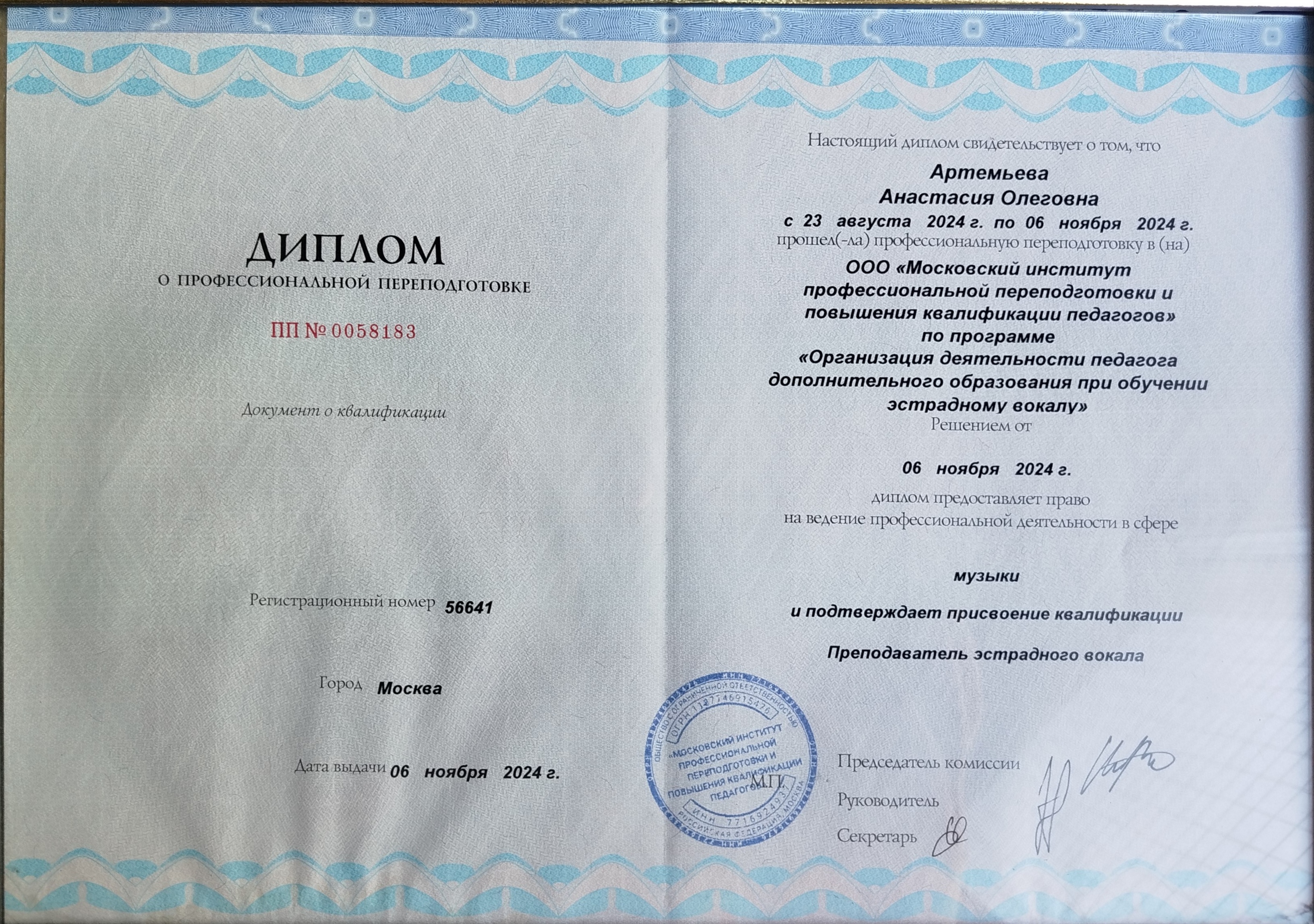 Московский институт профессиональной переподготовки и повышения квалификации педагогов по программе "Организация деятельности педагога дополнительного образования при обучении эстрадному вокалу", "Преподаватель эстрадного вокала", 2024 год.