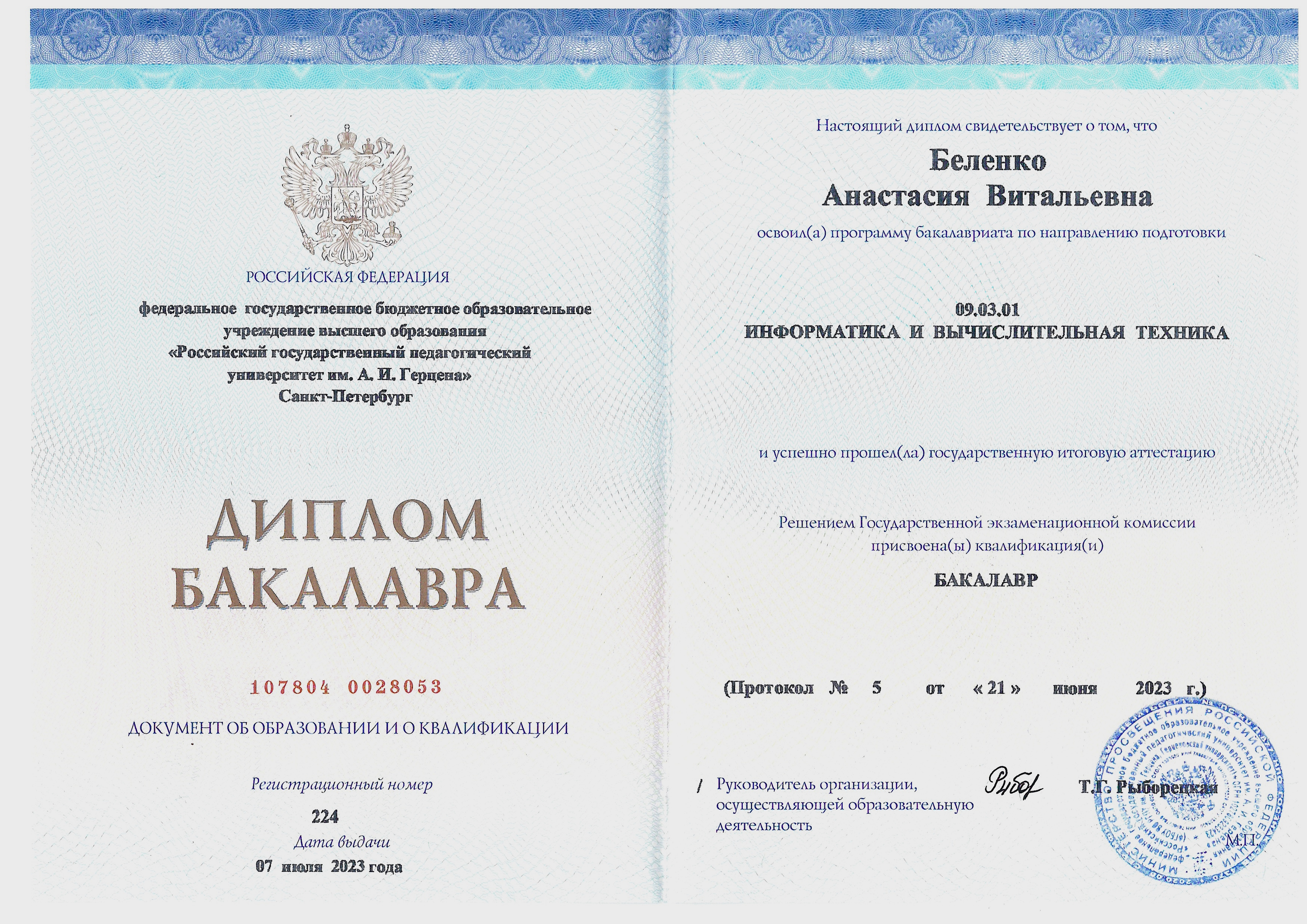 Образование: Российский Государственный Педагогический Университет имени А. И. Герцена, информатика и вычислительная техника, бакалавр, 2023 год.