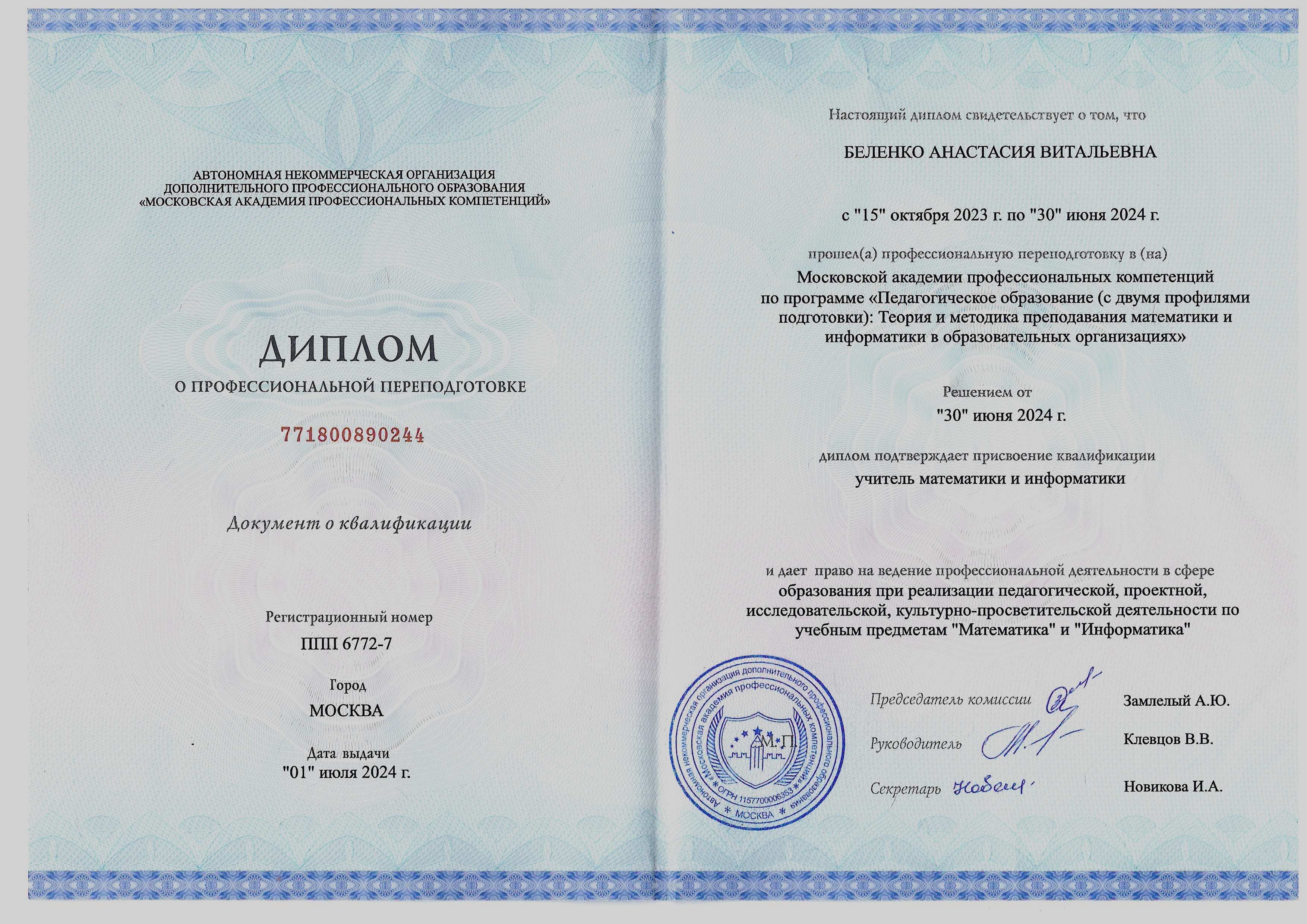 Московская Академия Профессиональных Компетенций по программе "Педагогическое образование (с двумя профилями подготовки). Теория и методика преподавания математики и информатики в образовательных организациях".