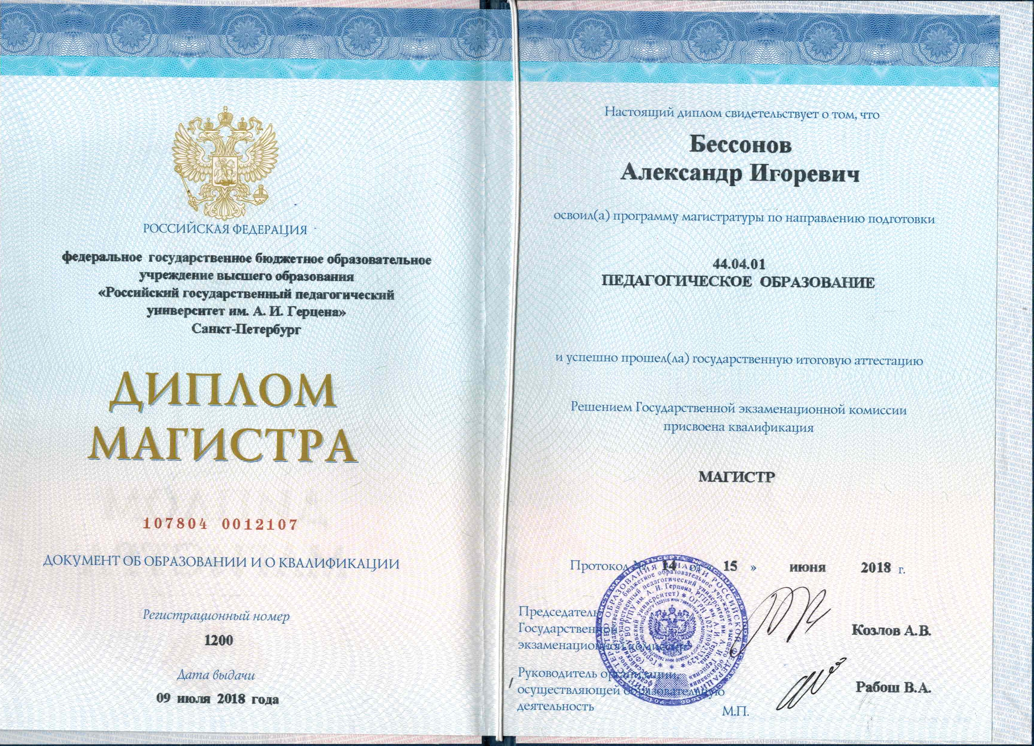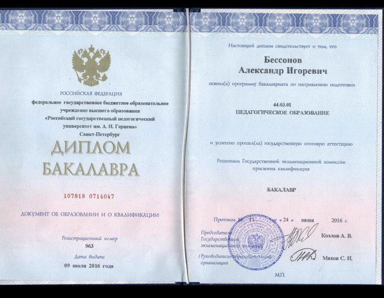 - Образование: РГПУ имени Герцена, педагогическое образование (бакалавр 2016 год, магистр 2018 год).