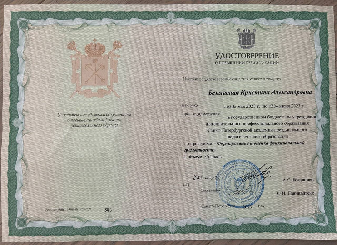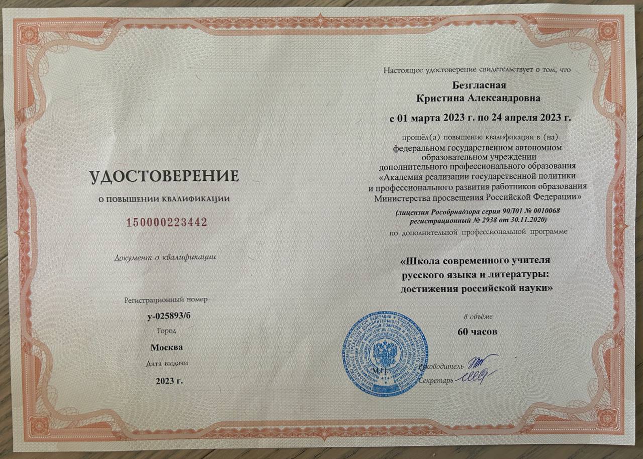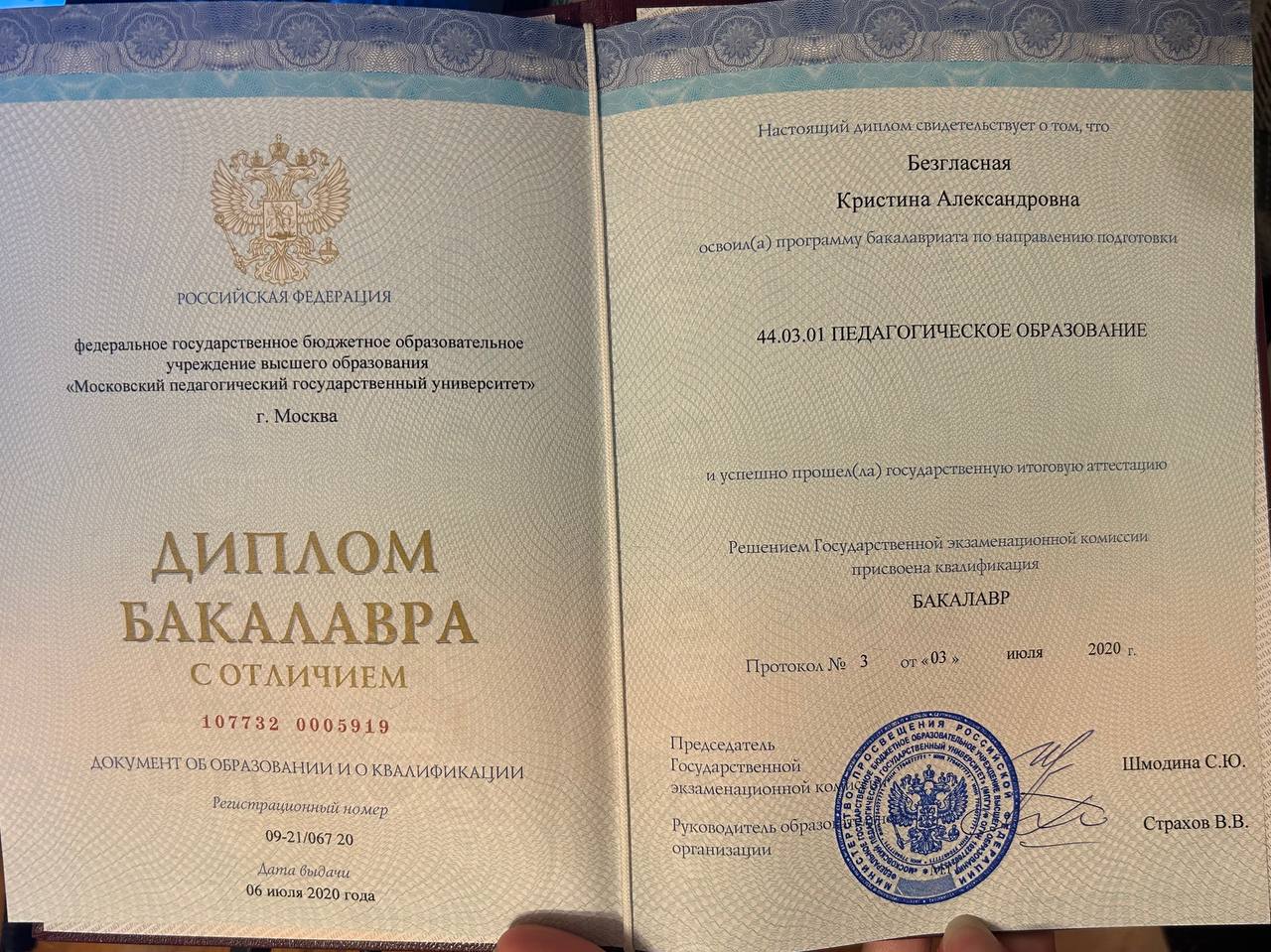 - Образование: Московский Педагогический Государственный Университет, педагогическое образование, диплом с отличием, бакалавр, 2020 год.