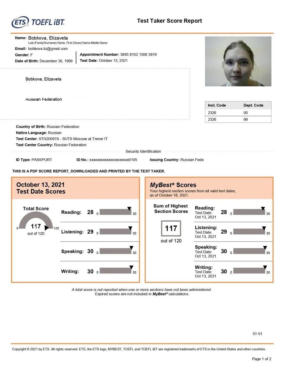 Мой результат сдачи TOEFL: 117/120 баллов. Мои ученики сдали экзамен с результатом 86 и 101....