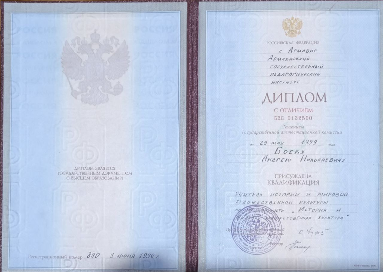 Образование: АГПИ (Армавир), учитель истории и мировой художественной культуры, диплом с отличием, специалист, 1999 год.