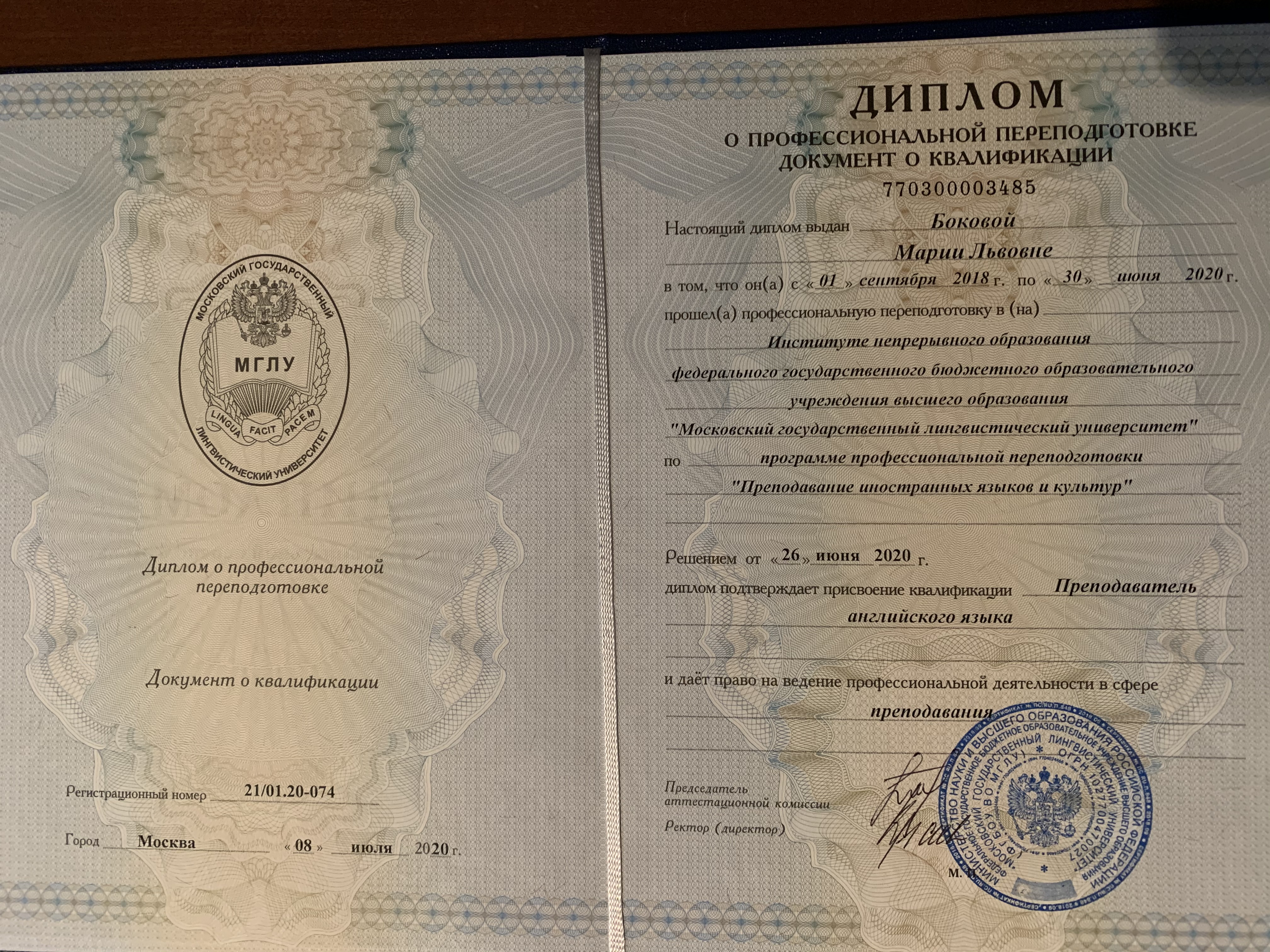 Московский Государственный лингвистический Университет, преподаватель английского языка, 2020 год.