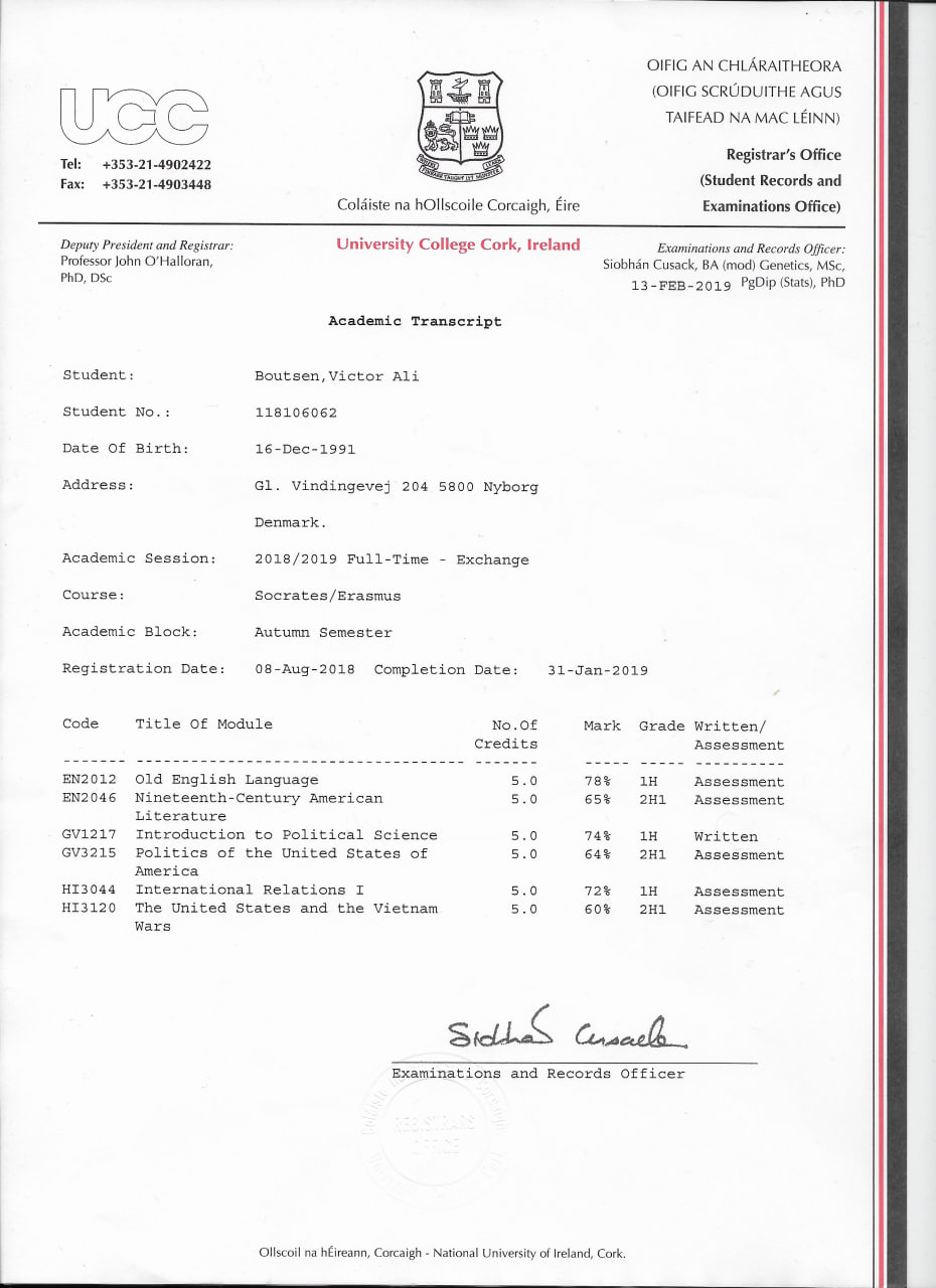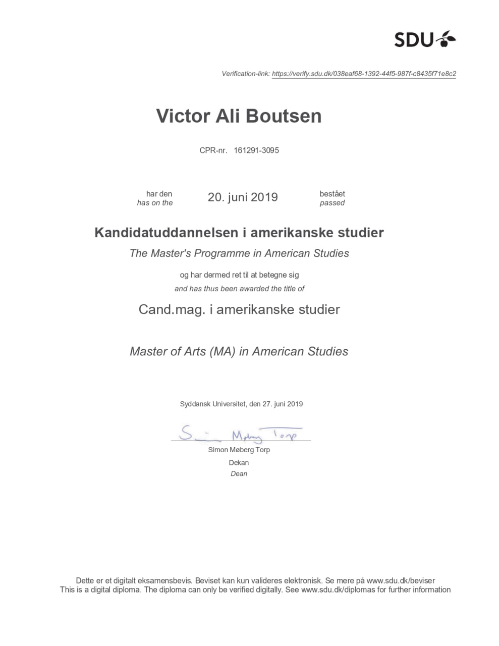 University of Southern Denmark (Дания), магистр искусств в области американистики (2017 год - 2019 год).