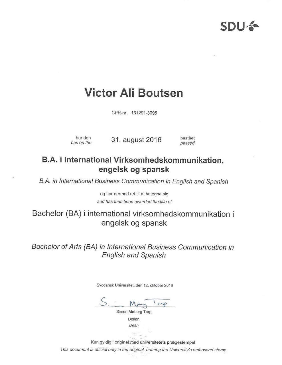 Образование: University of Southern Denmark (Дания), бакалавр искусств в области международного делового общения на английском и испанском языках (2012 год - 2016 год).
