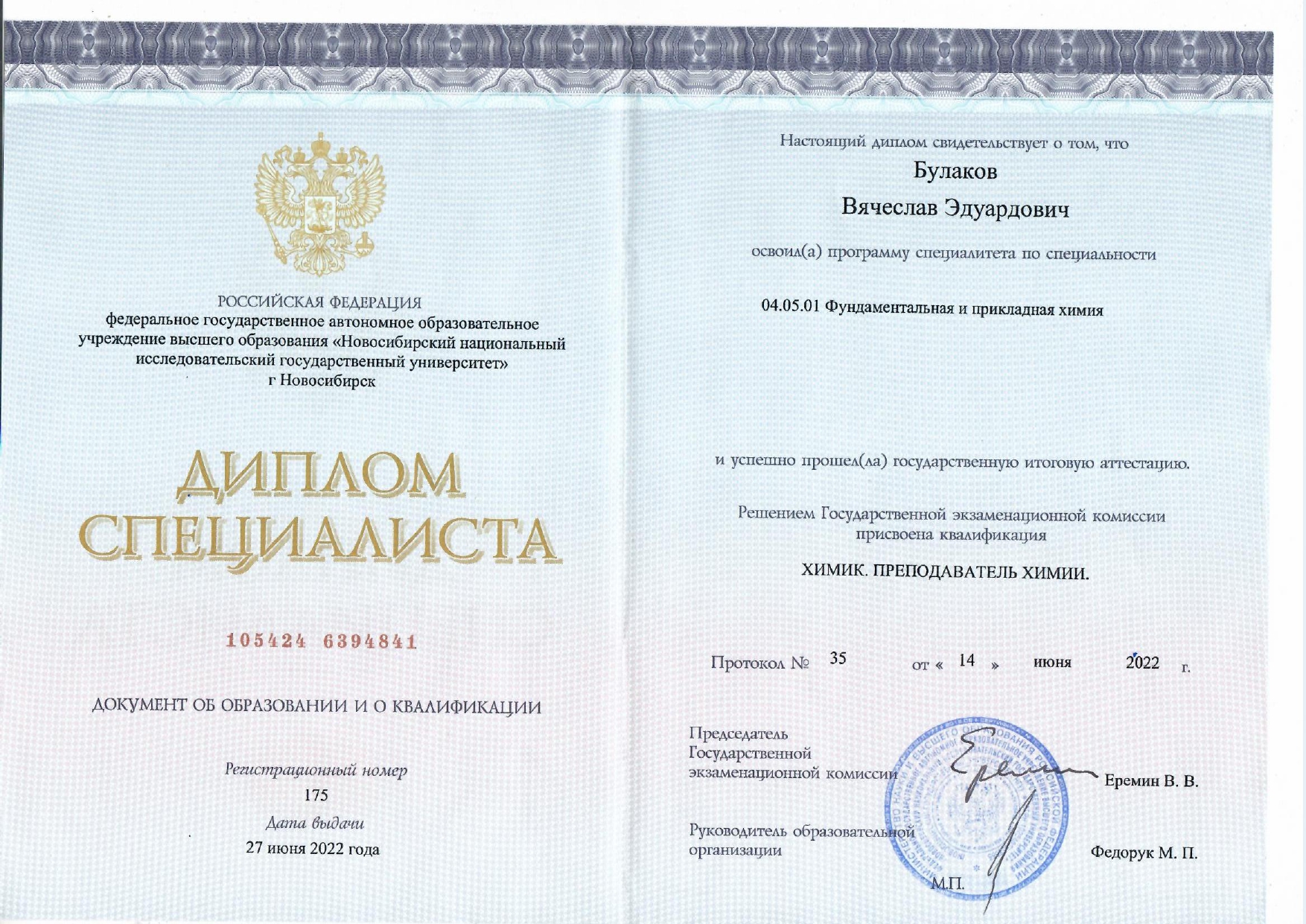 - Образование: Выпускник Новосибирского Государственного Университета по специальности «Фундаментальная и прикладная химия», специалитет с квалификацией диплома «Химик. Преподаватель химии», 2022 год.