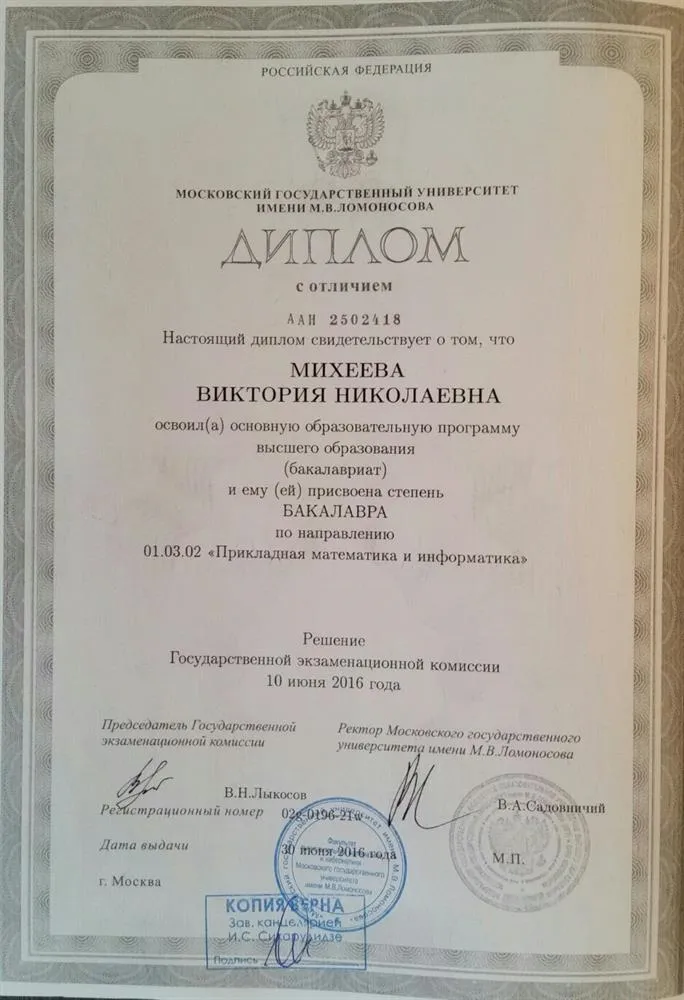 - Образование: МГУ имени Ломоносова, факультет "Вычислительная математика и кибернетика", "Прикладная математика и информатика", бакалавр, диплом с отличием, 2016 год.