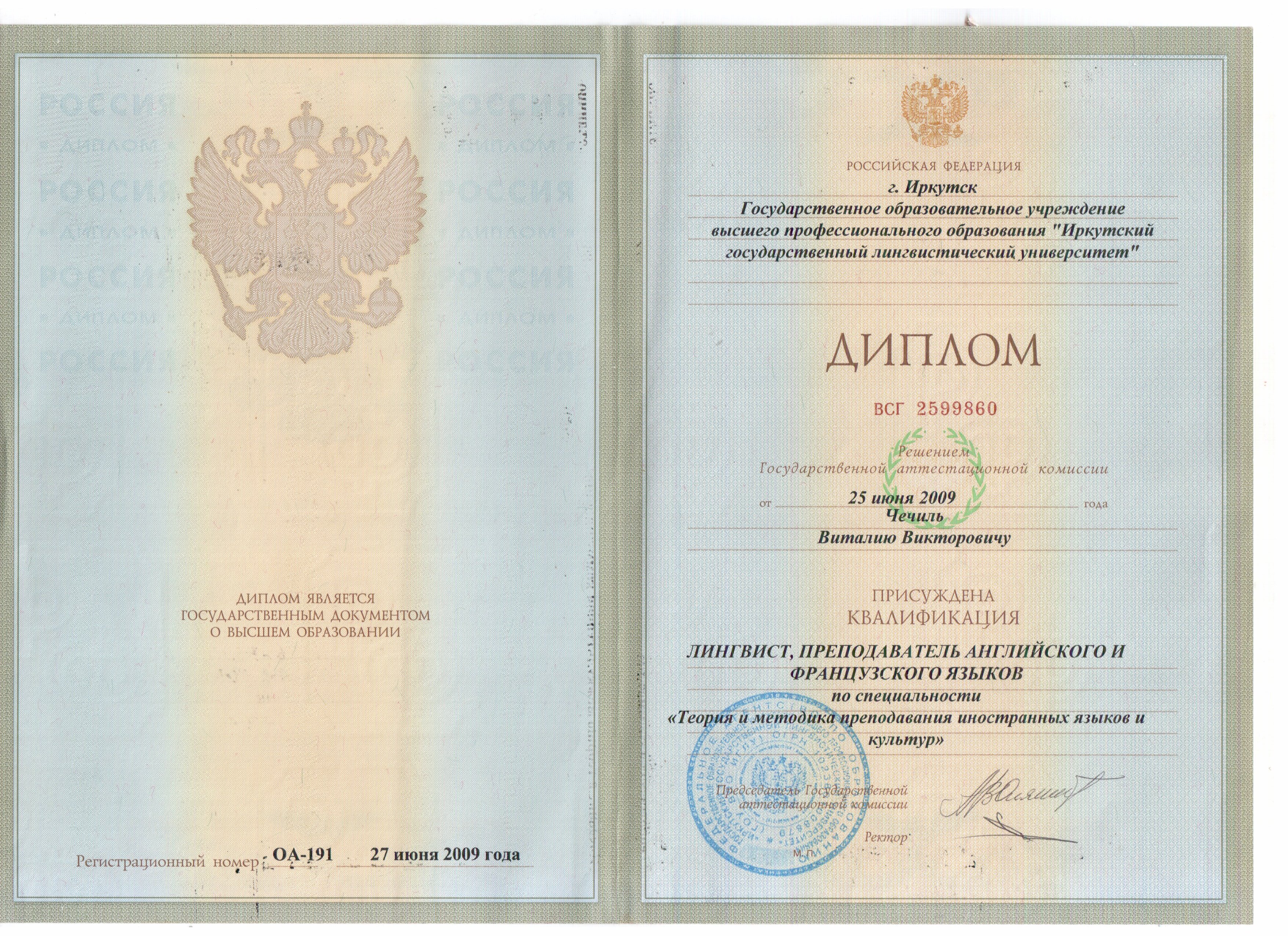 - Образование: Иркутский Государственный Лингвистический Университет, "Лингвист. Преподаватель английского и французского языков", специалист, 2009 год.