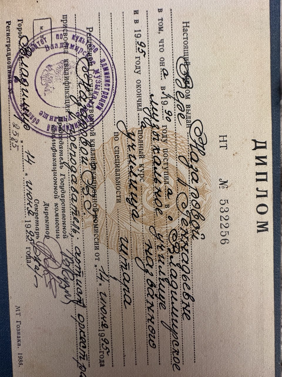 - Образование: Владимирское Музыкальное Училище, гитара, "Преподаватель, артист оркестра", 1995 год.