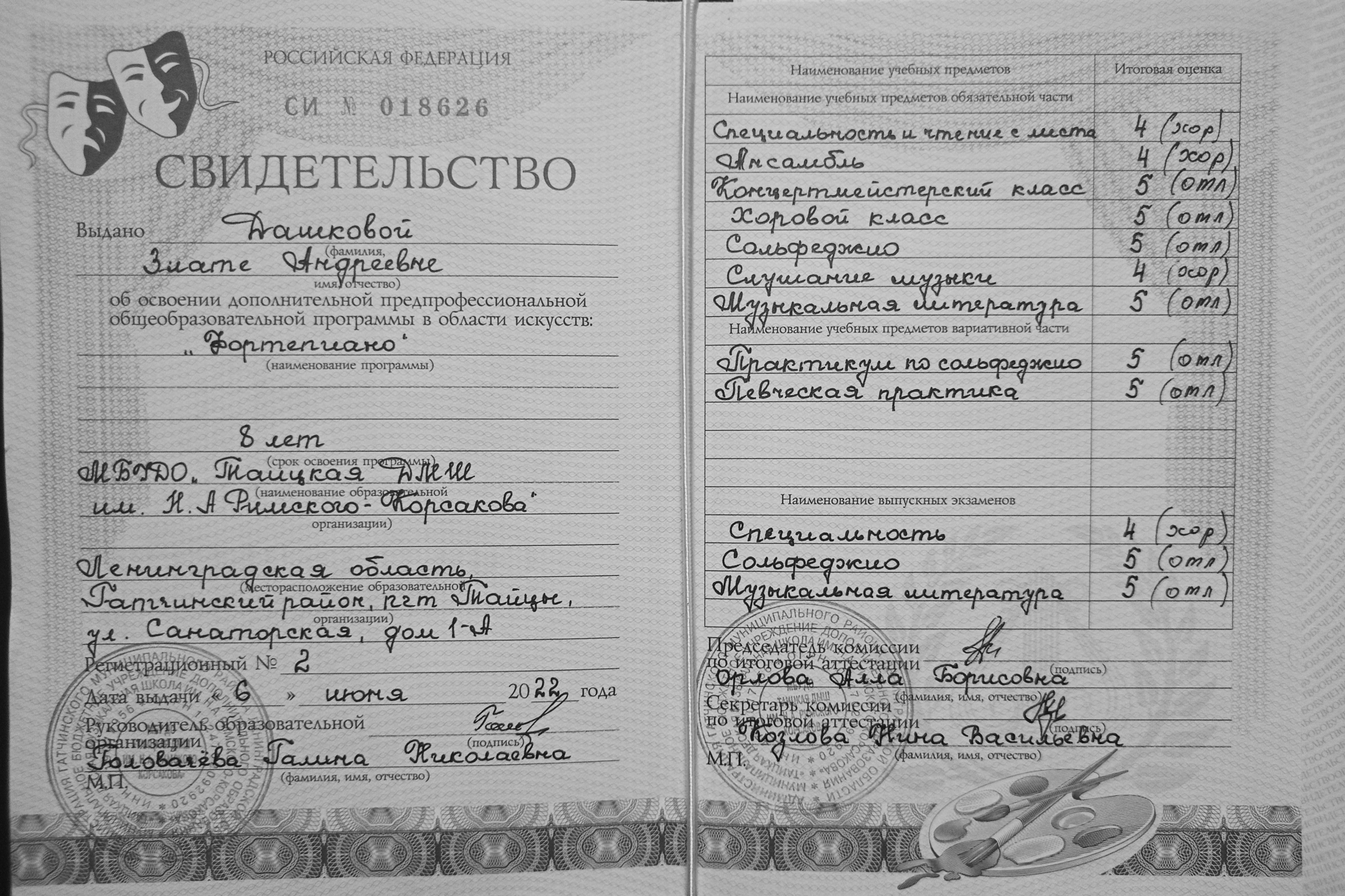 Образование: 8 лет музыкальной школы по специальности фортепиано, 2022 год.