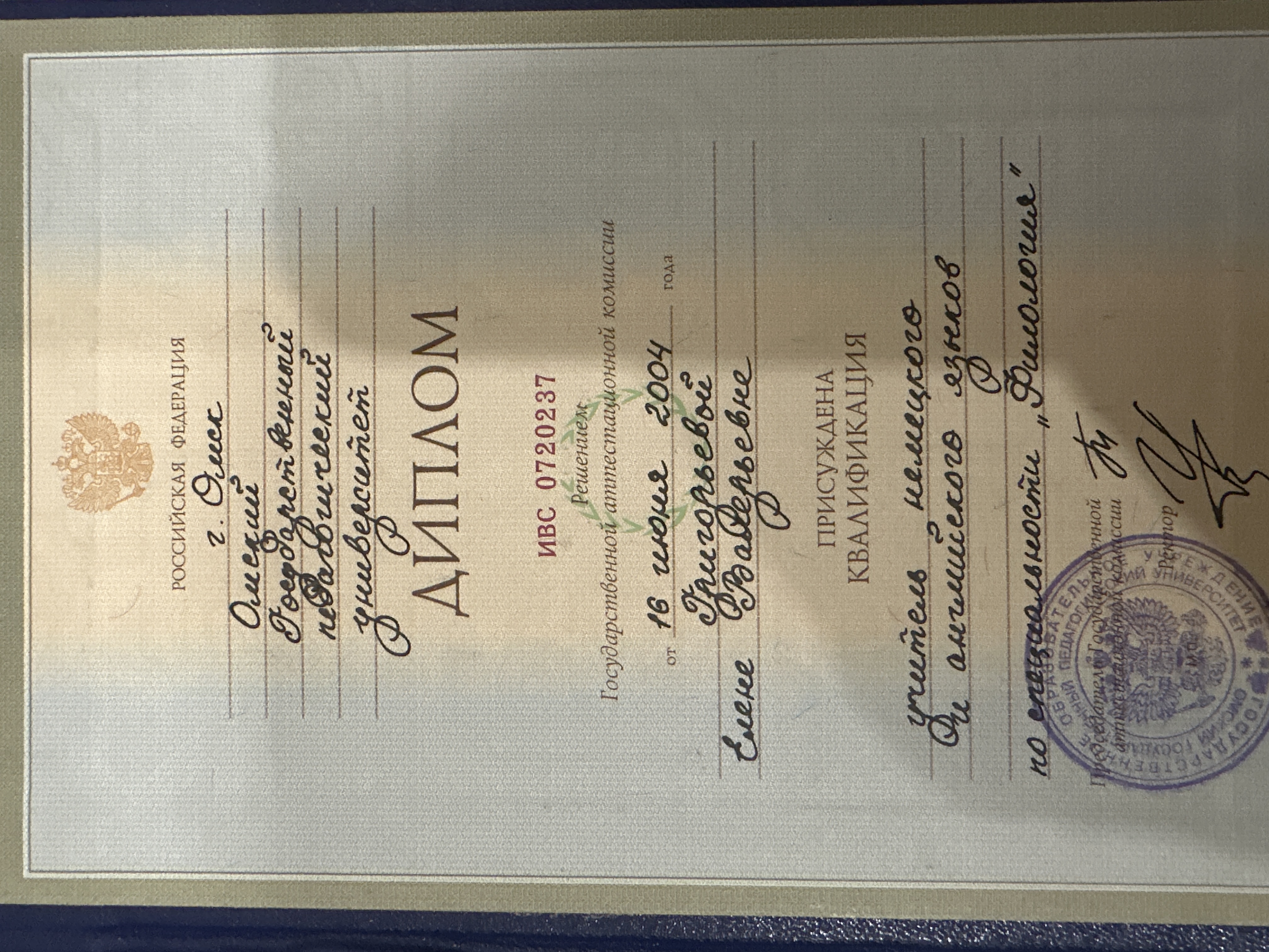 - Образование: Высшее, Омский Государственный Педагогический Университет, филология, " Учитель английского и немецкого языков", специалист, 2004 год.