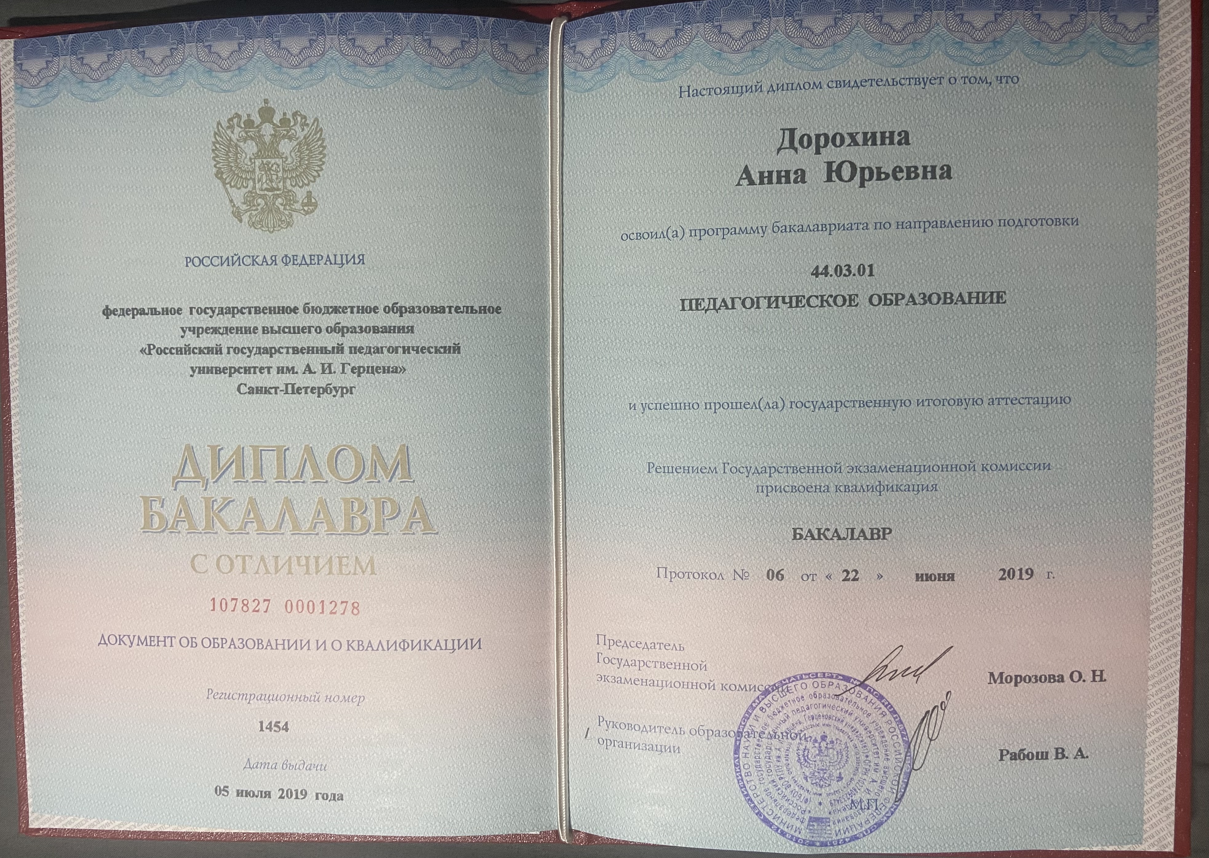 - Образование: С отличием окончила РГПУ имени А. И. Герцена, «Раннее обучение иностранным языкам», бакалавр, 2019 год.