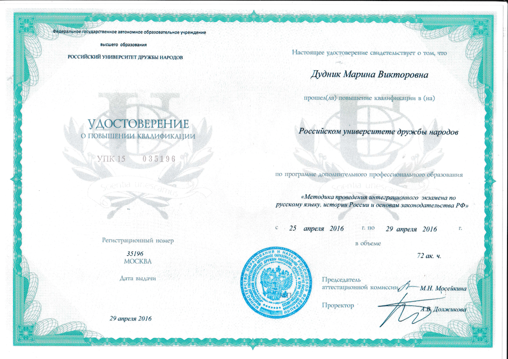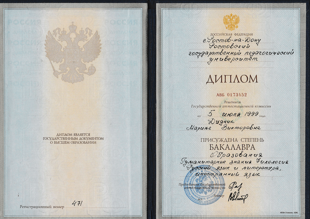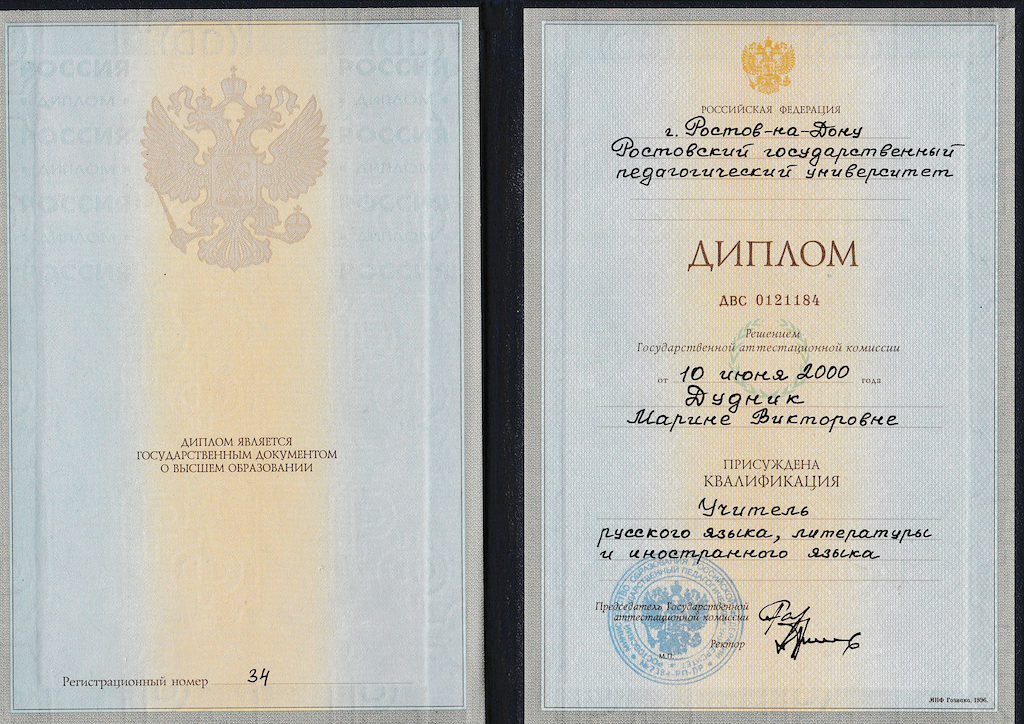 - Образование: Ростовский Государственный Педагогический Университет, "Учитель русского языка, литературы и иностранного языка", специалист, 2000 год.
