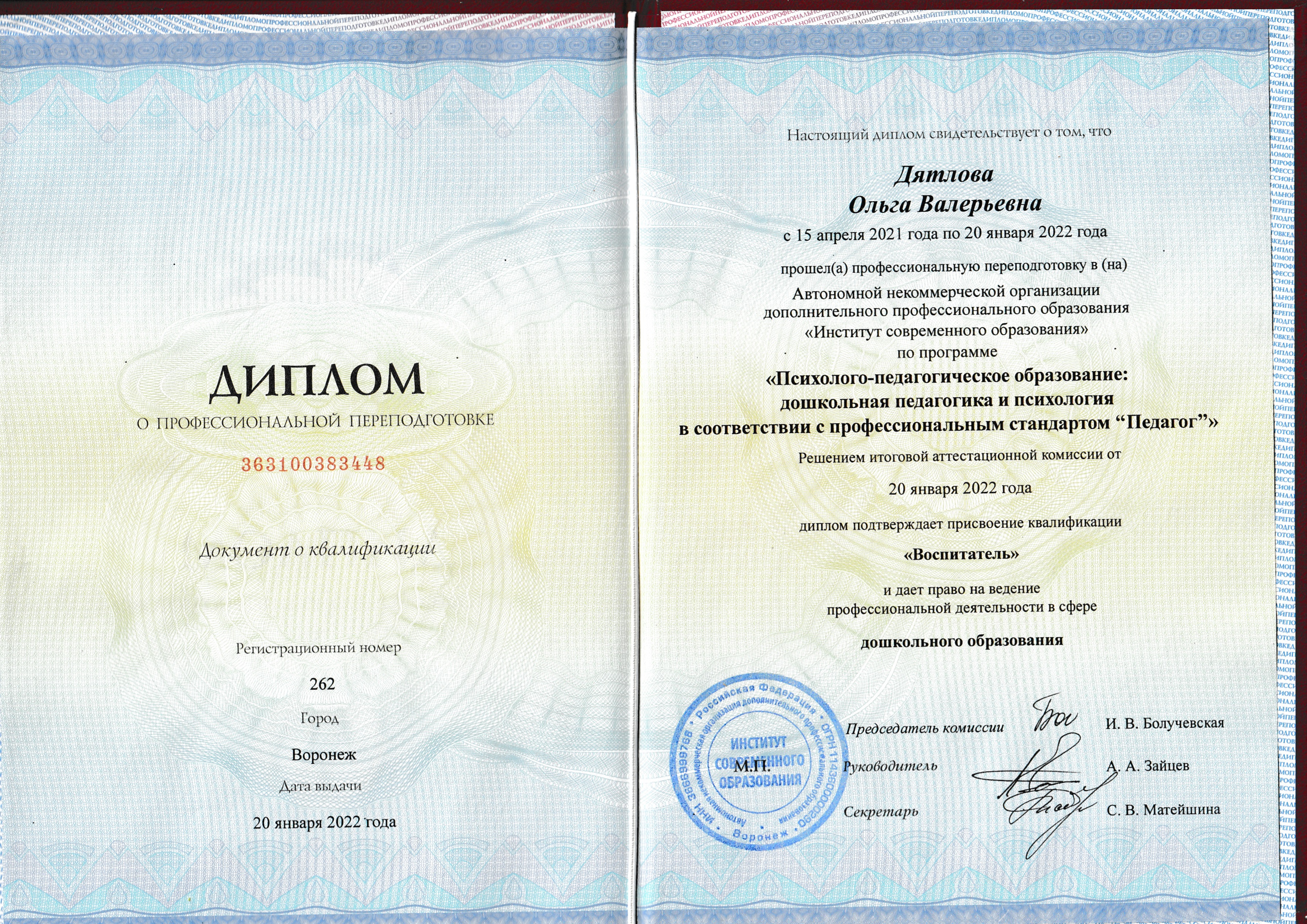 Образование: Воронежский Педагогический Институт, психолого-педагогическое образование, дошкольная педагогика и психология, воспитатель, 2021 год.