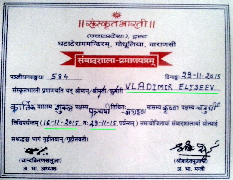 Успешно прошел курсы разговорного самскрита в Самскрита Бхарати, Варанси, Индия.