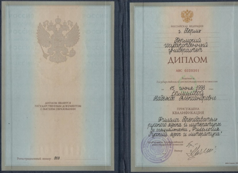 Образование: Пермский Государственный Университет, филологический факультет, 1998 год.
