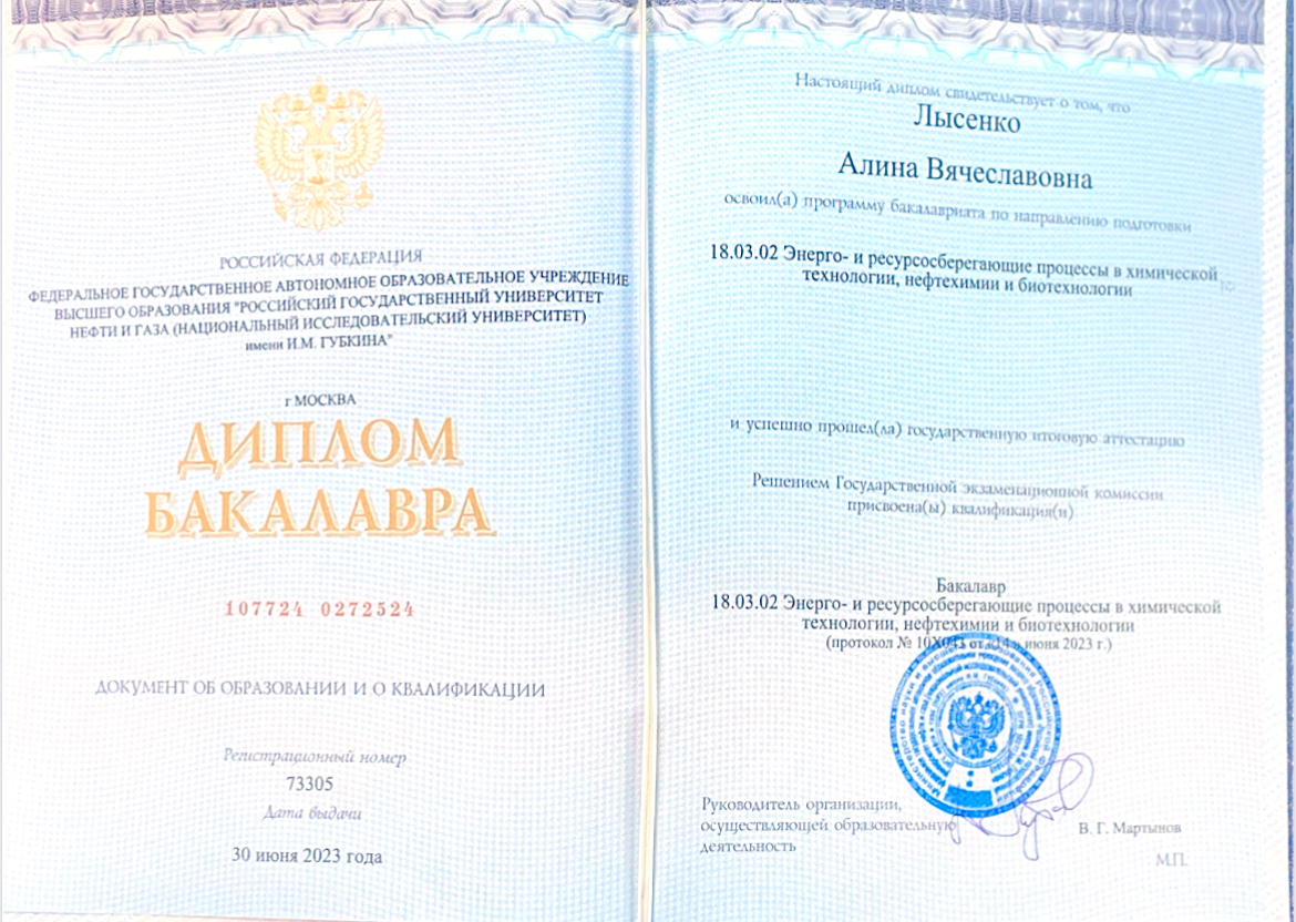 - Образование: РГУНГ имени Губкина, "Энерго- и ресурсосберегающие процессы в химической технологии, нефтехимии и биотехнологии", бакалавр, 2023 год.
