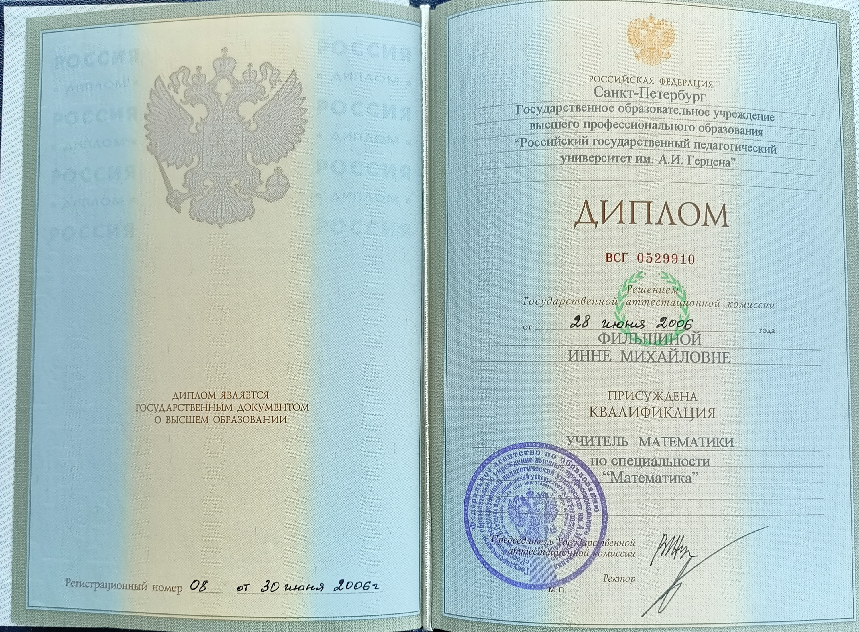 - Образование: РГПУ имени Герцена, "Учитель математики", специалист, 2006 год.