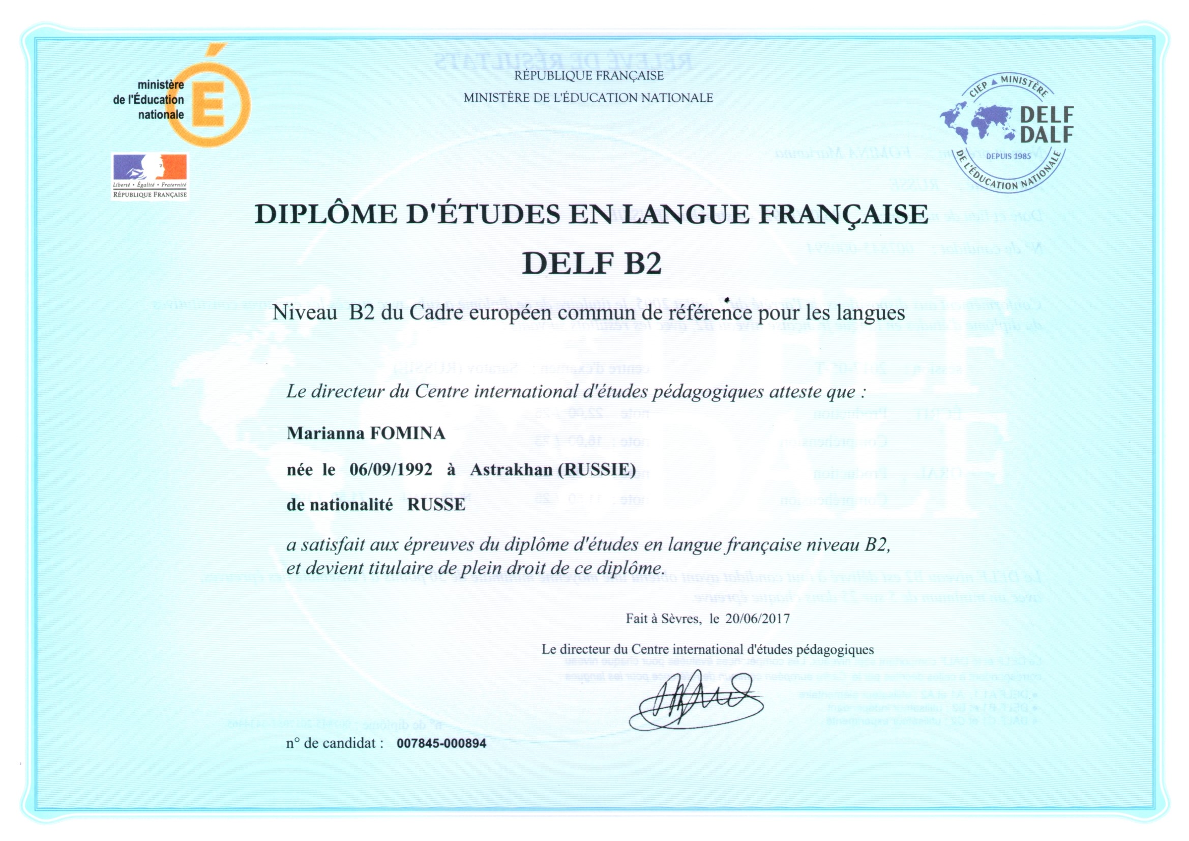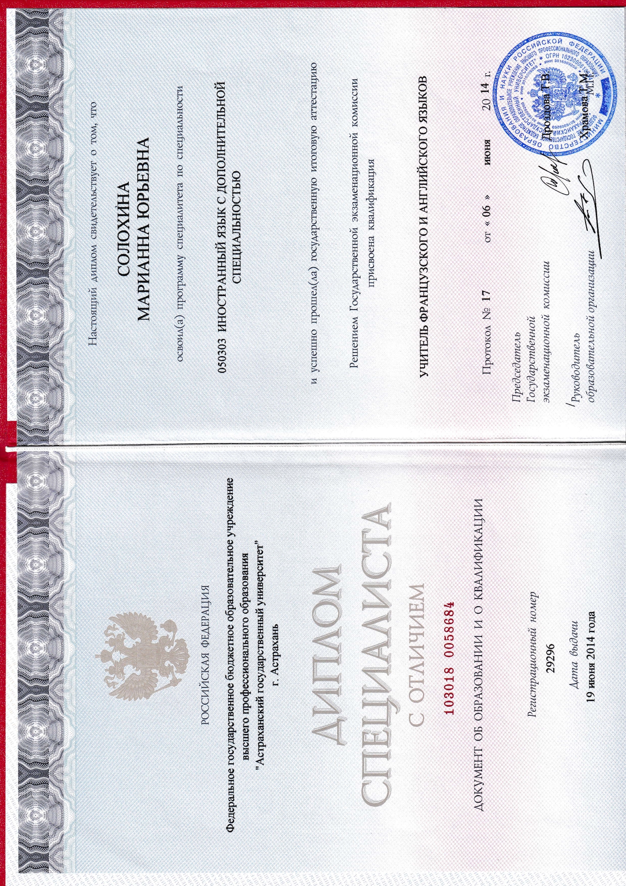 - Образование: Высшее, Астраханский Государственный Университет, учитель французского и английского языков, красный диплом, специалист, 2014 год.