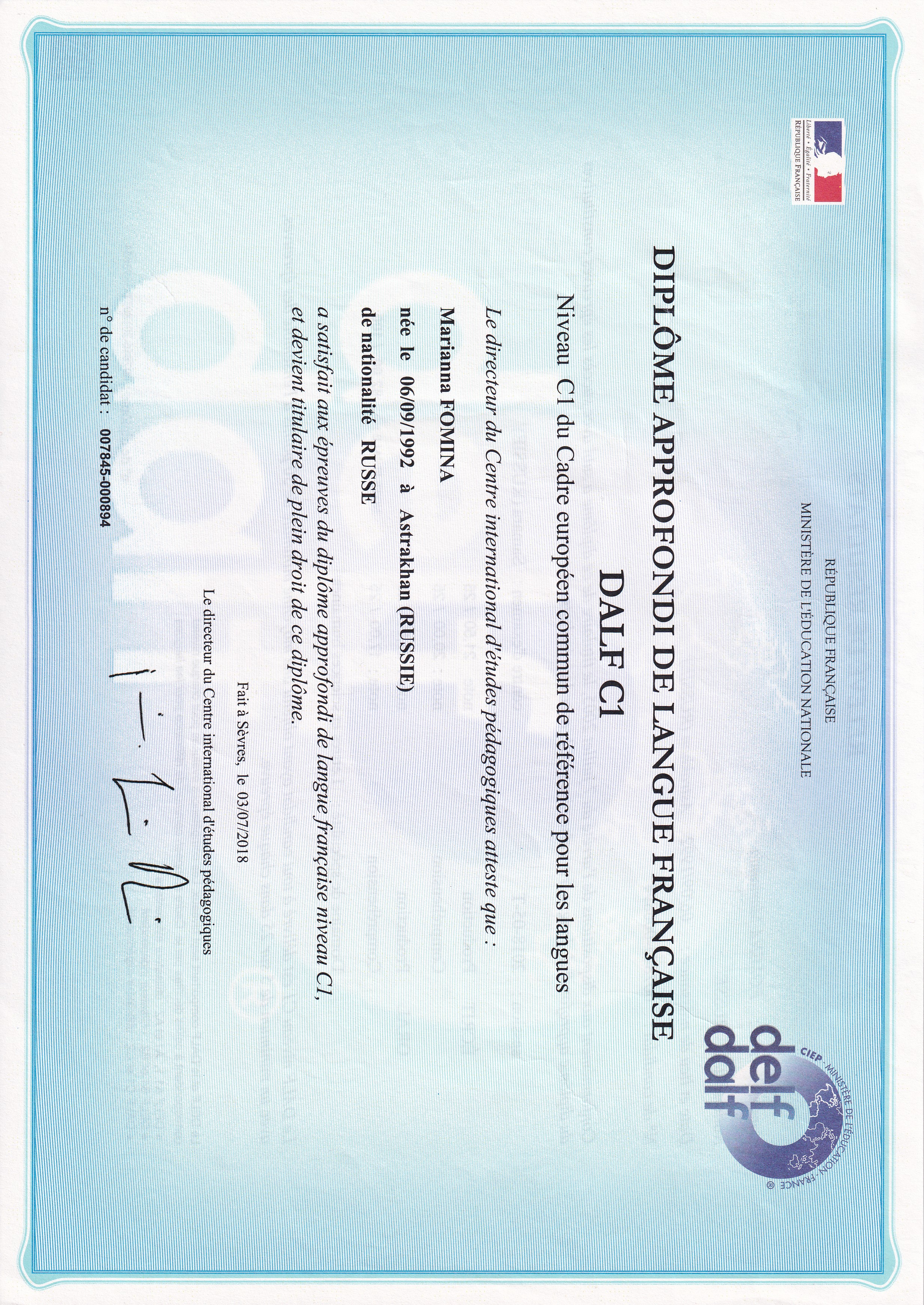 Изучаю французский язык с 5 класса школы и являюсь большим фанатом французского языка. Дипломы Министерства образования Франции DELF B2, DALF C1. Французский язык - очень понятен и логичен, и даже сами французы говорят : "Если это непонятно, значит это не на французском".
