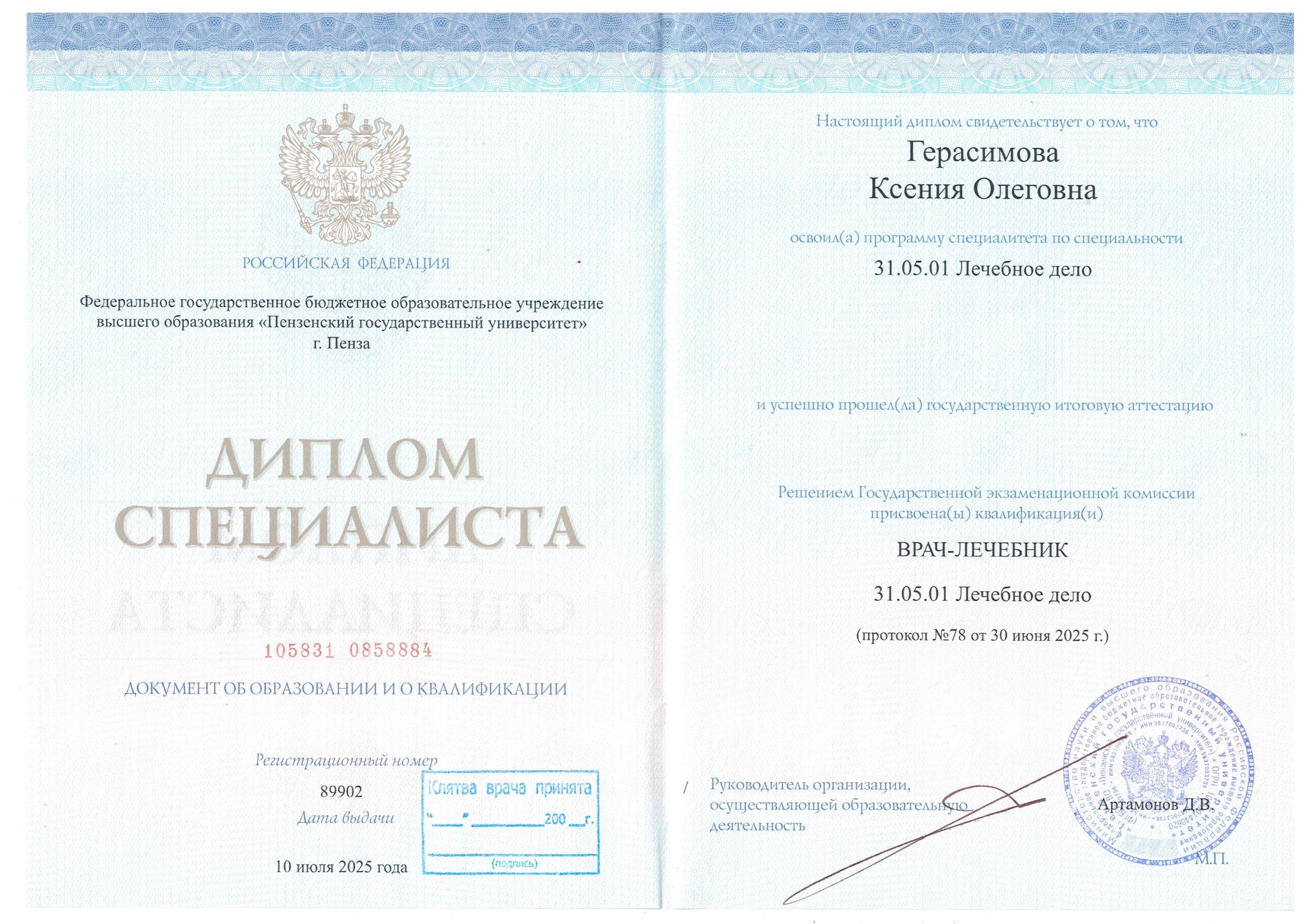 - Образование: Высшее, Пензенский Государственный Университет, лечебное дело, специалист, 2025 год.