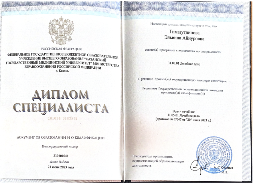 - Образование: Казанский Государственный Медицинский Университет, лечебное дело, специалист, 2023 год.