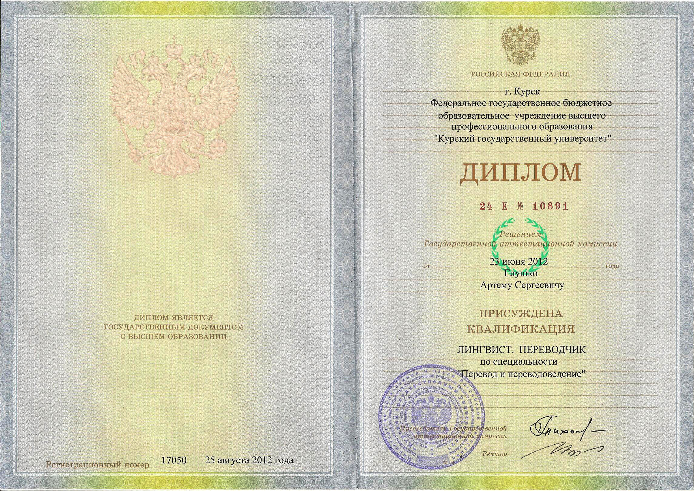 - Образование: Окончил Курский Государственный Университет по специальности «Перевод и переводоведение» с присуждённой квалификацией «Лингвист. Переводчик», специалист, 2012 год.