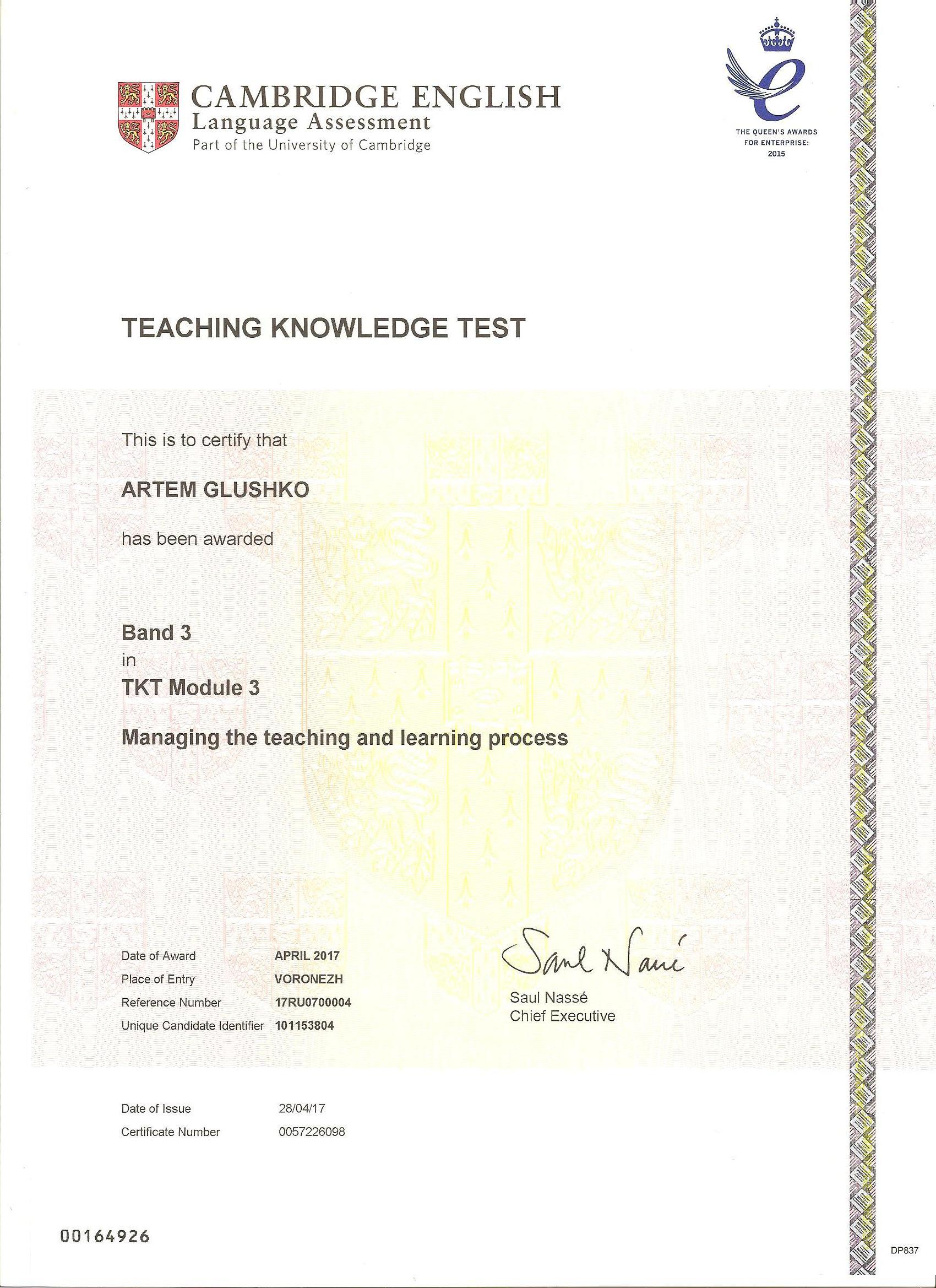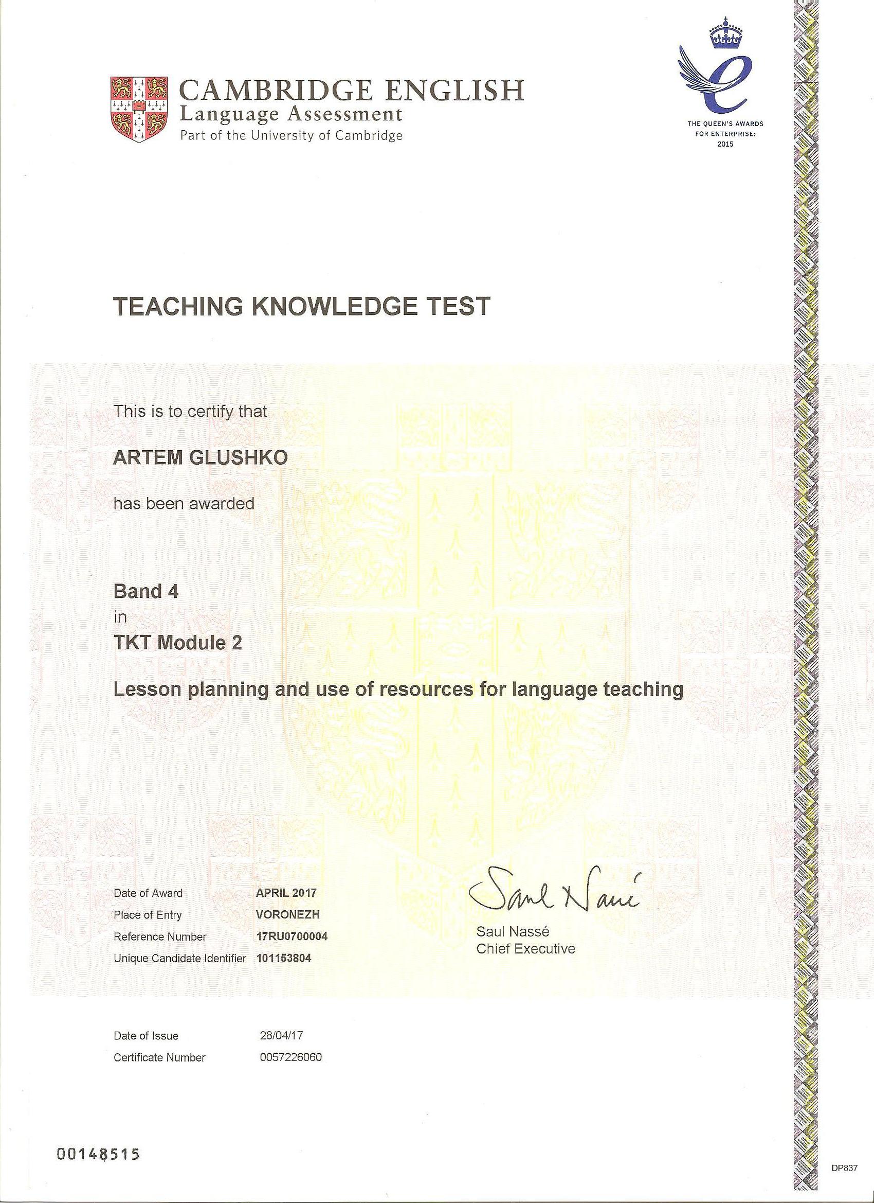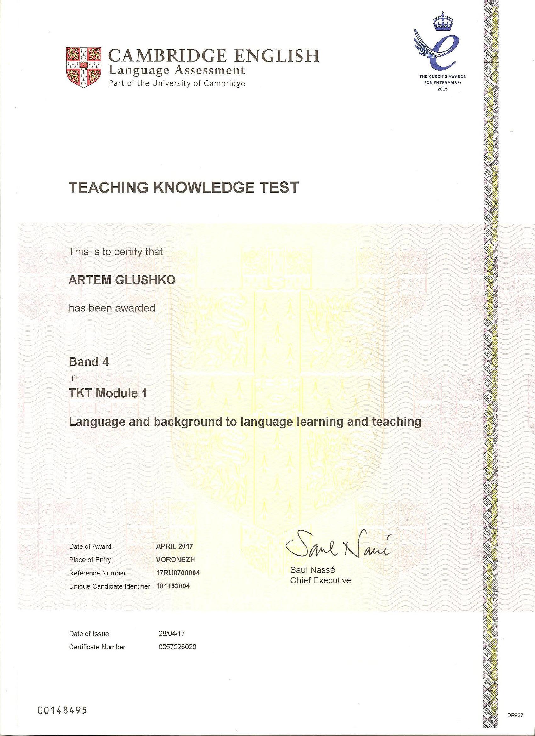 Свой смысл жизни я нашёл в преподавании английского языка, чем с радостью и занимаюсь уже на протяжении 15 лет. Имеется кембриджский сертификат TKT (Teaching Knowledge Test) для учителей, сданный мной на максимально возможный балл (Band 4). Первый сертификат свидетельствует о доскональном знании самого английского языка в то время как второй подтверждает моё умение строить и планировать занятия в краткосрочной и долгосрочной перспективе....
