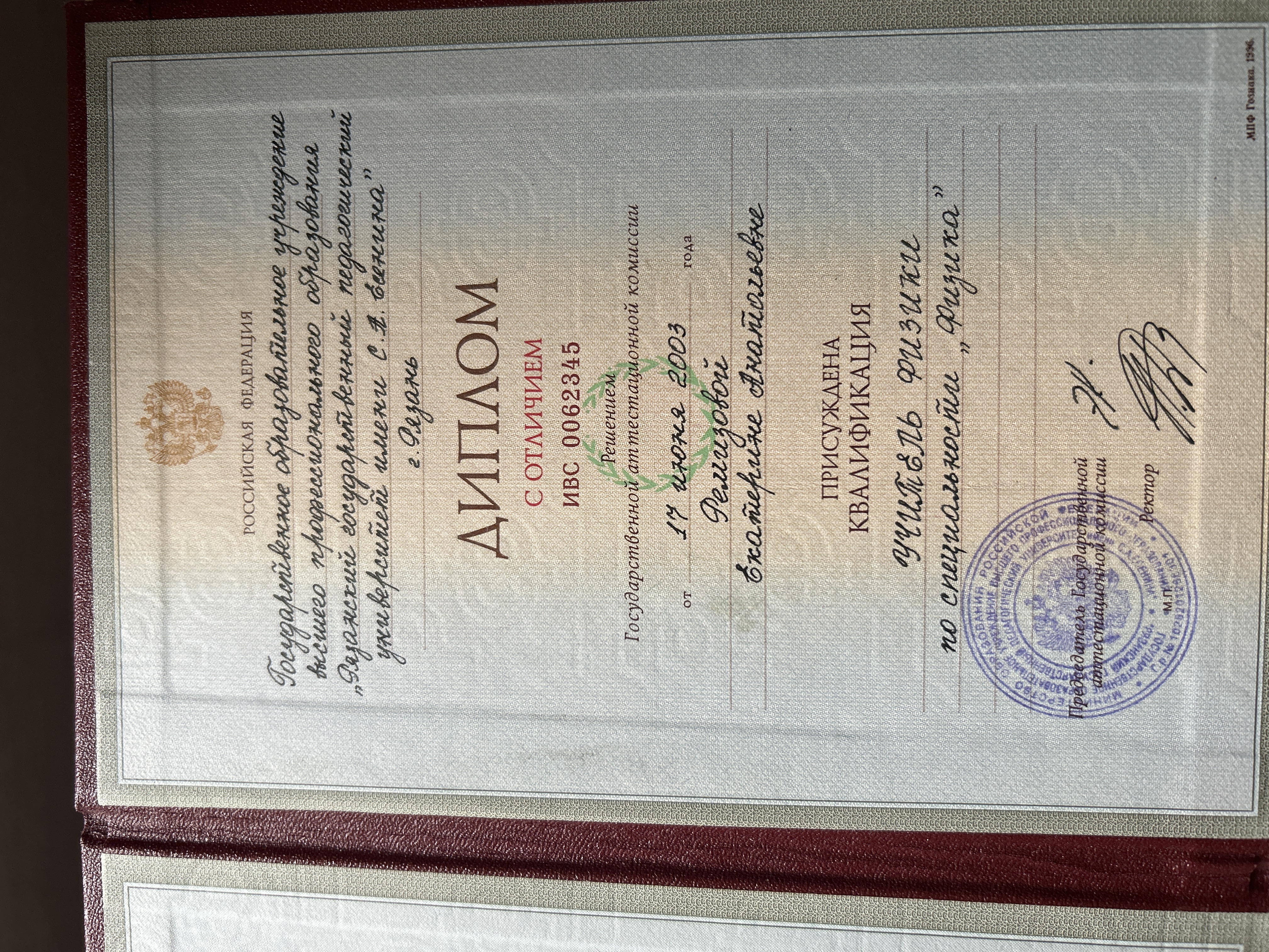 - Образование: Рязанский Государственный Педагогический Университет, специальность «Учитель физики», специалист, 2003 год
