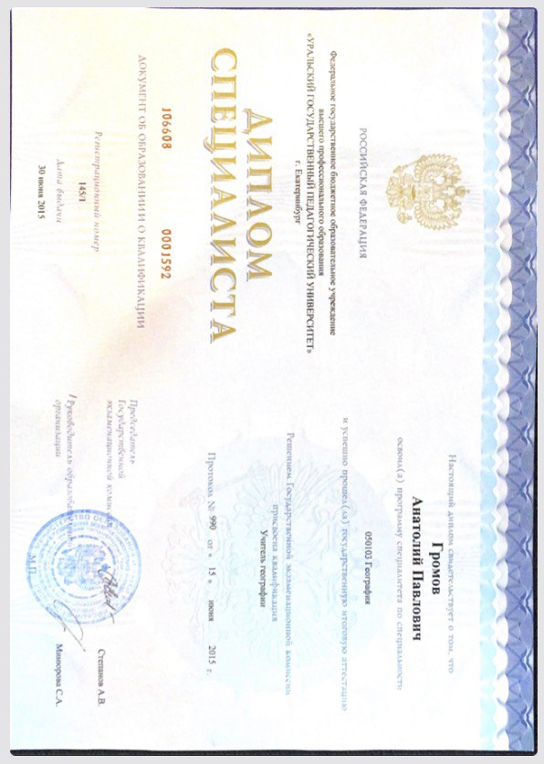 - Образование: Высшее, Уральский Государственный Орден Почётный Знак Педагогический Университет, "География и биология", специалист, 2015 год.