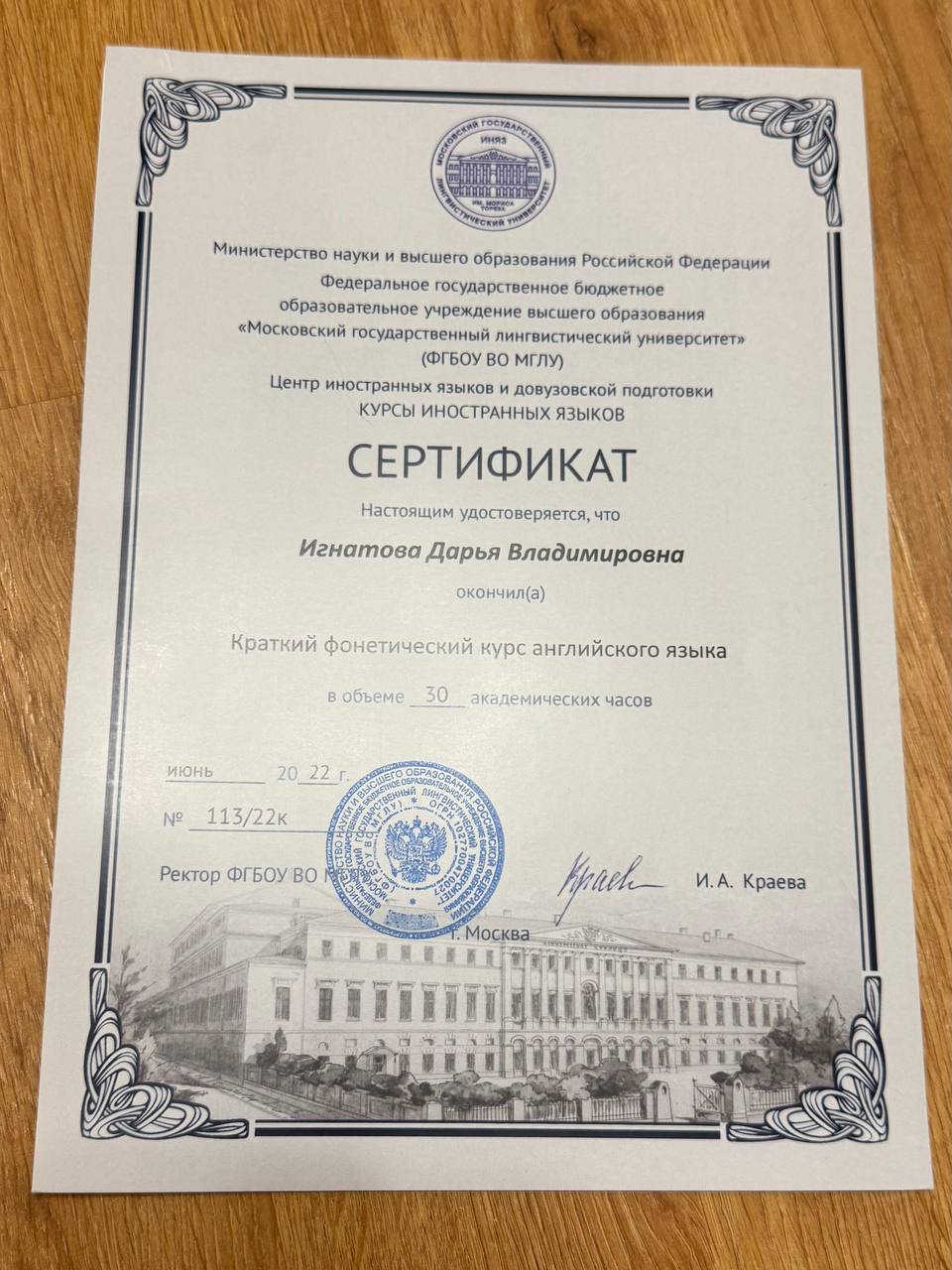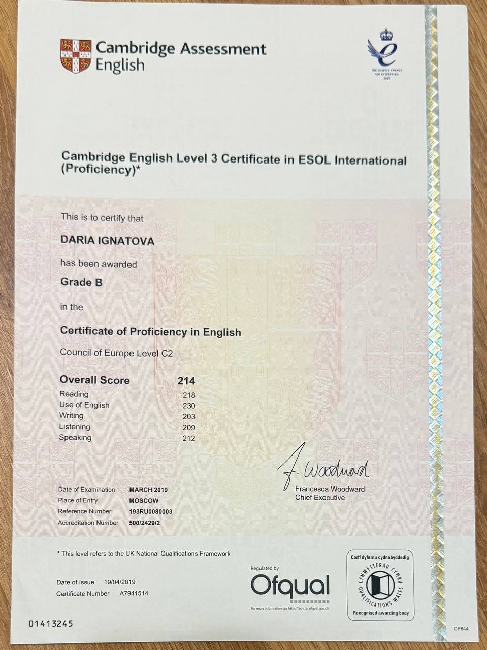 CPE - 2019 год. IELTS (band 8) - 2025 год. DELE C1 - 2019 год (испанский). CILS B2 - 2019 год (итальянский).