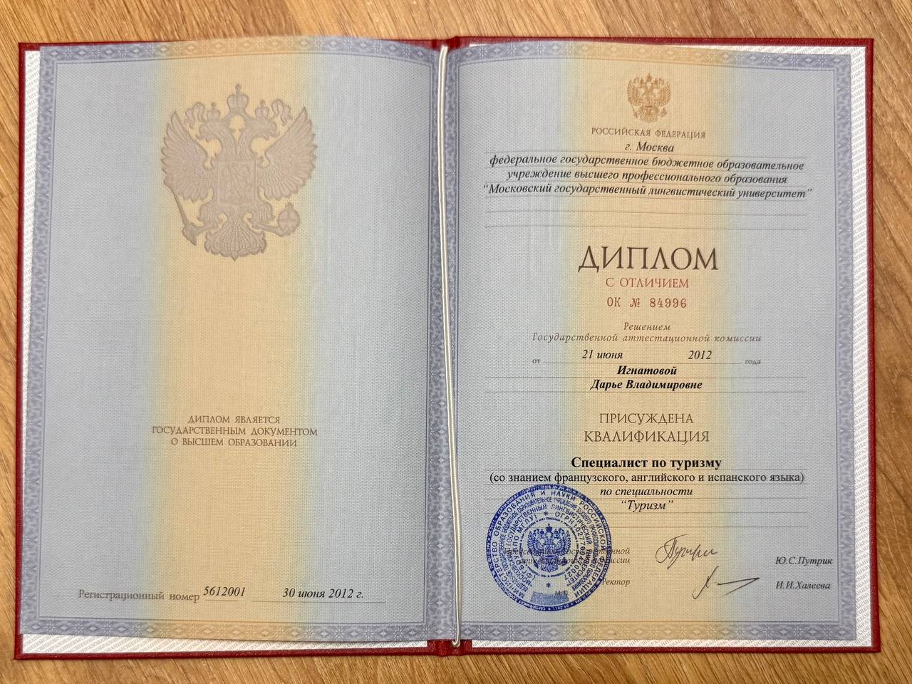 Образование: Окончила МГЛУ с тремя иностранными языками (английский, французский, испанский), специалист, 2012 год.