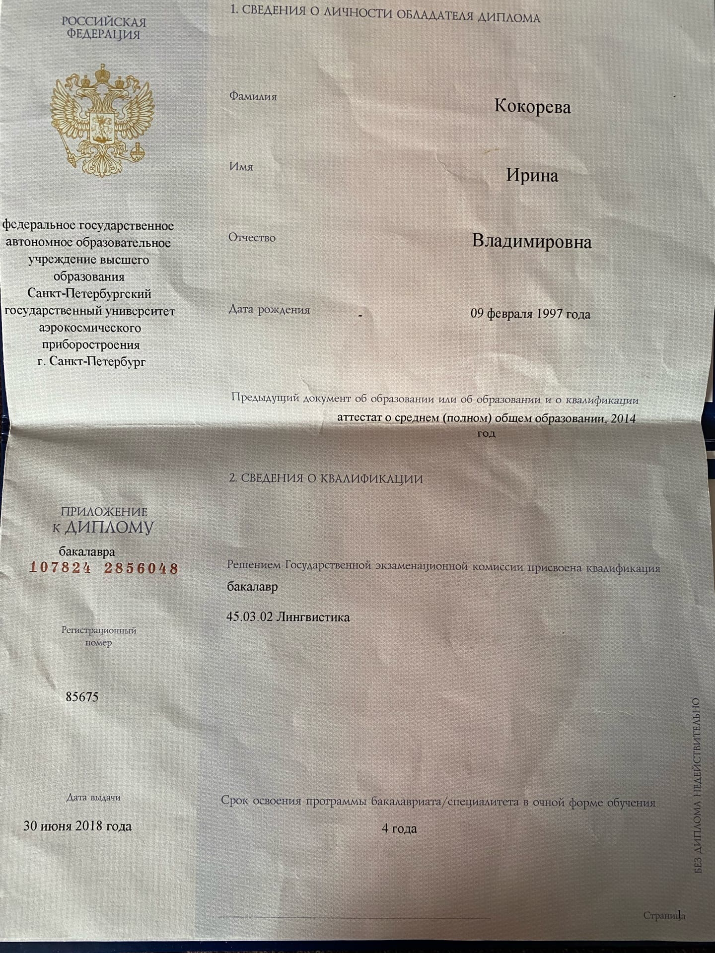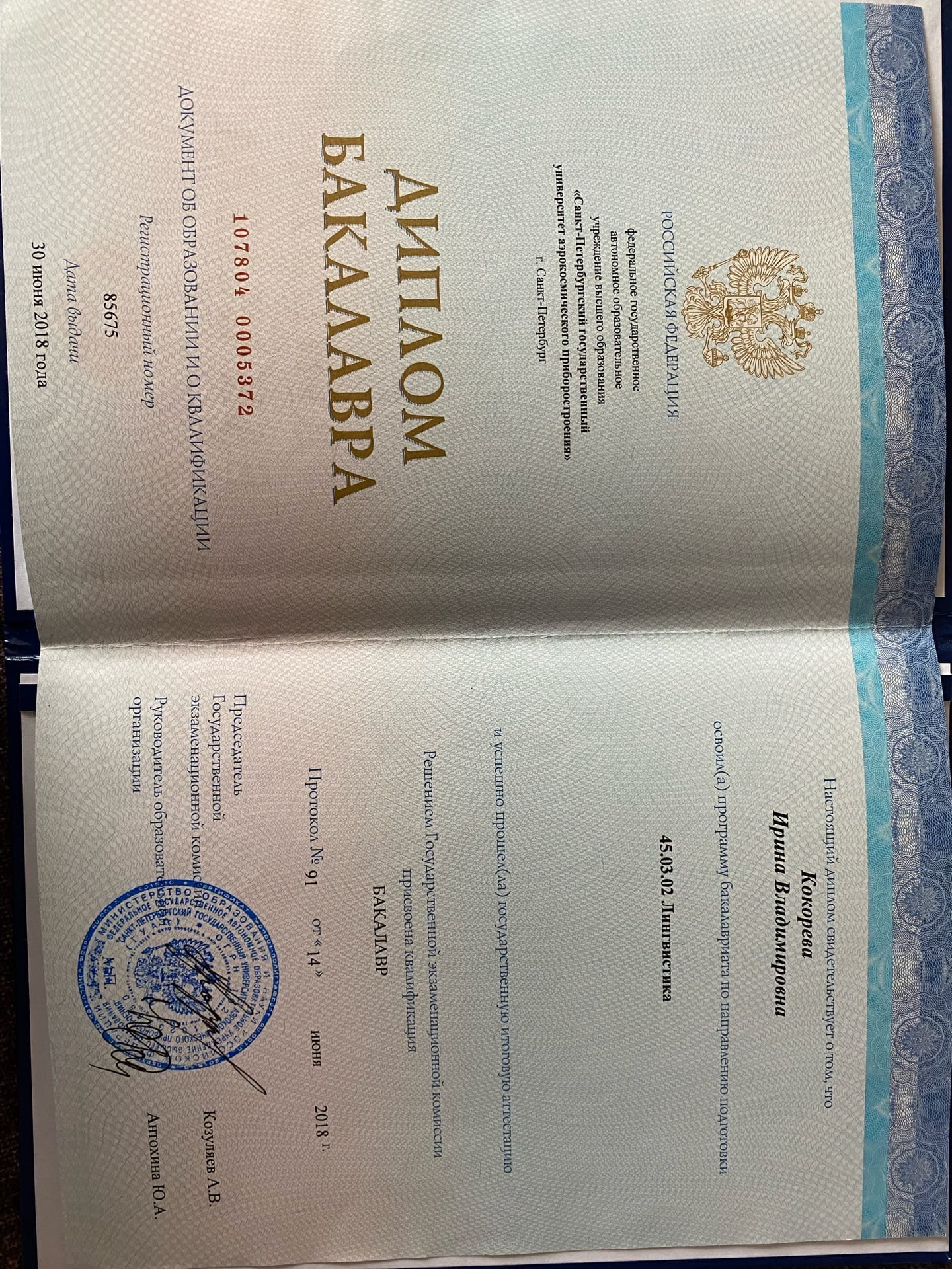 Образование: Санкт-Петербургский Государственный Университет Аэрокосмического Приборостроения, "Лингвистика", бакалавр, 2018 год.