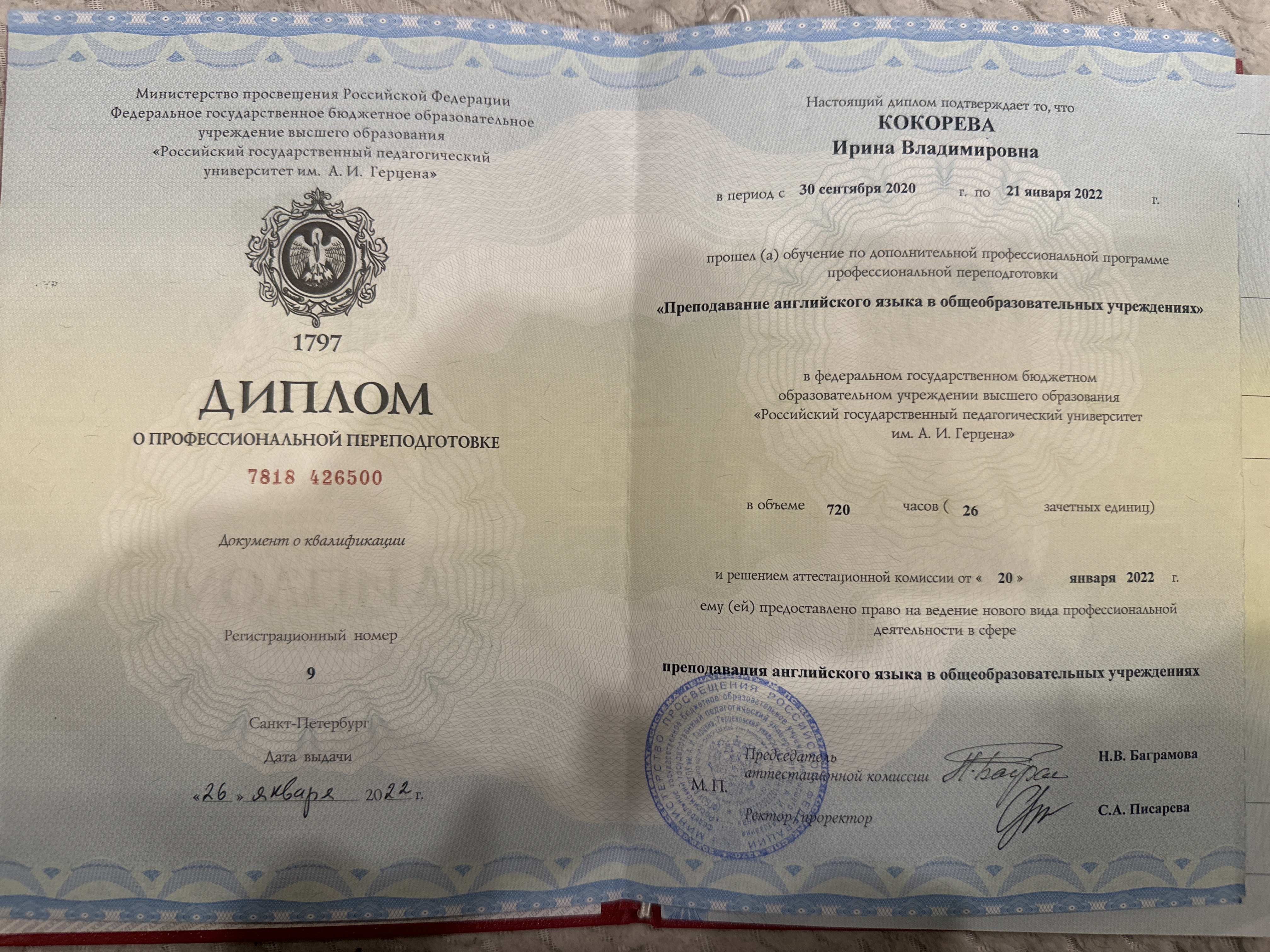 Диплом о профессиональном образовании, РГПУ имени Герцена, "Преподавание английского языка в общеобразовательных учреждениях", 2022 год.