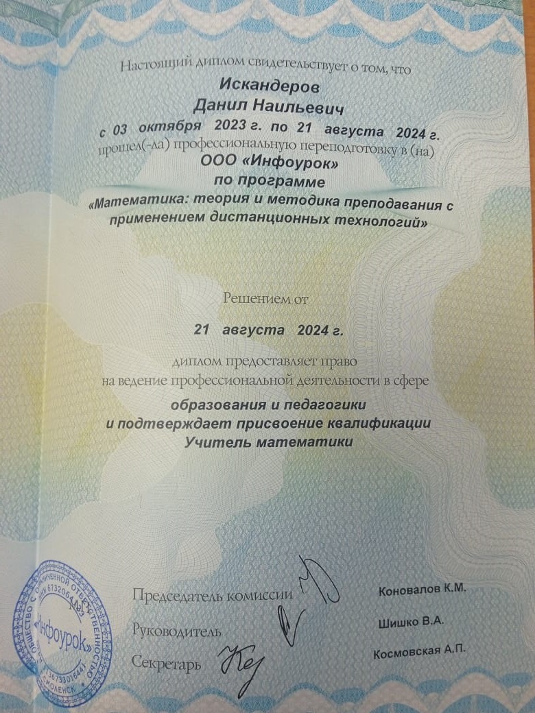 ООО “Инфоурок”, профессиональная переподготовка по программе “Математика: теория и методика преподавания с применением дистанционных технологий”,