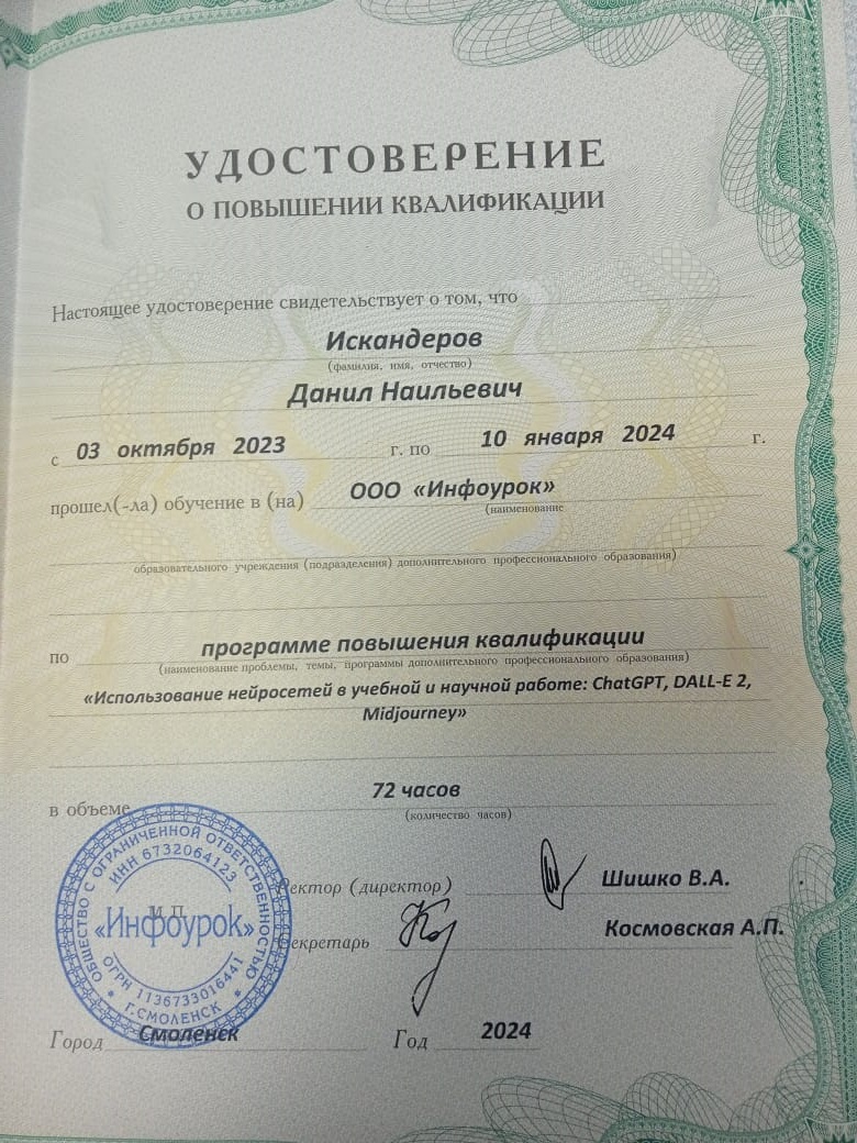 ООО “Инфоурок”, повышение квалификации по программе "Использование нейросетей в учебной и научной работе: Chat GPT, DALLE-E 2, Midjourney".
