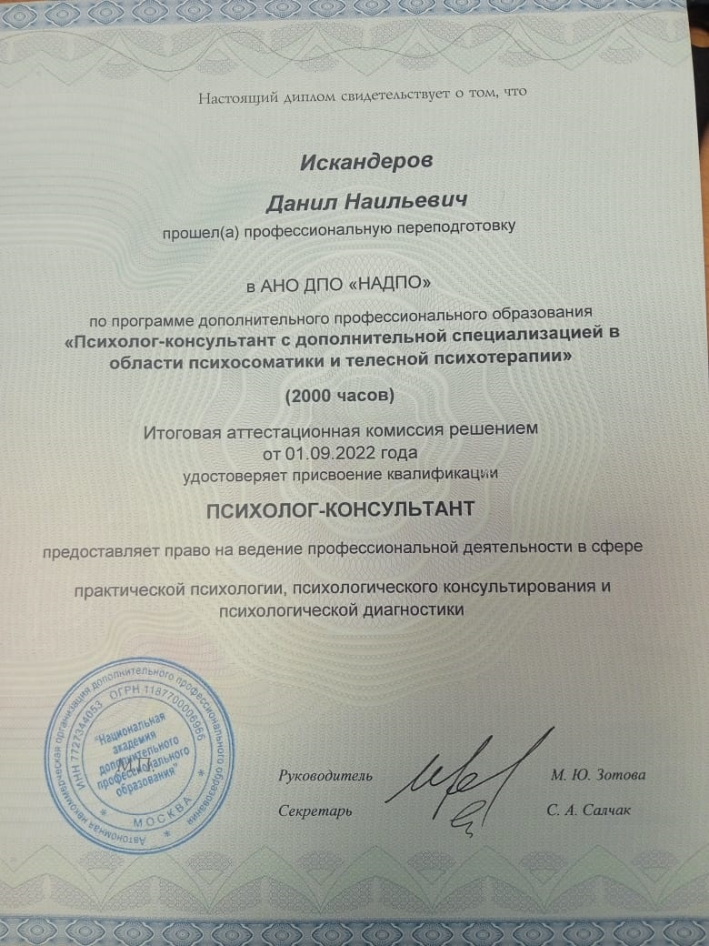 АНО ДПО “Национальная академия дополнительного профессионального образования”, профессиональная переподготовка по программе “Психолог-консультант с дополнительной специализацией в области психосоматики и телесной психотерапии”, психолог-консультант.
