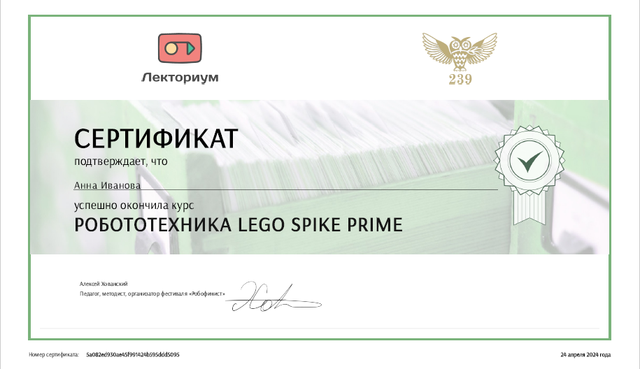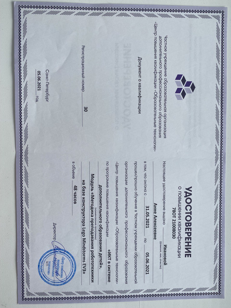 РГПУ имени Герцена, педагогическое образование, "Робототехника", магистр, диплом с отличием, 2021 год.