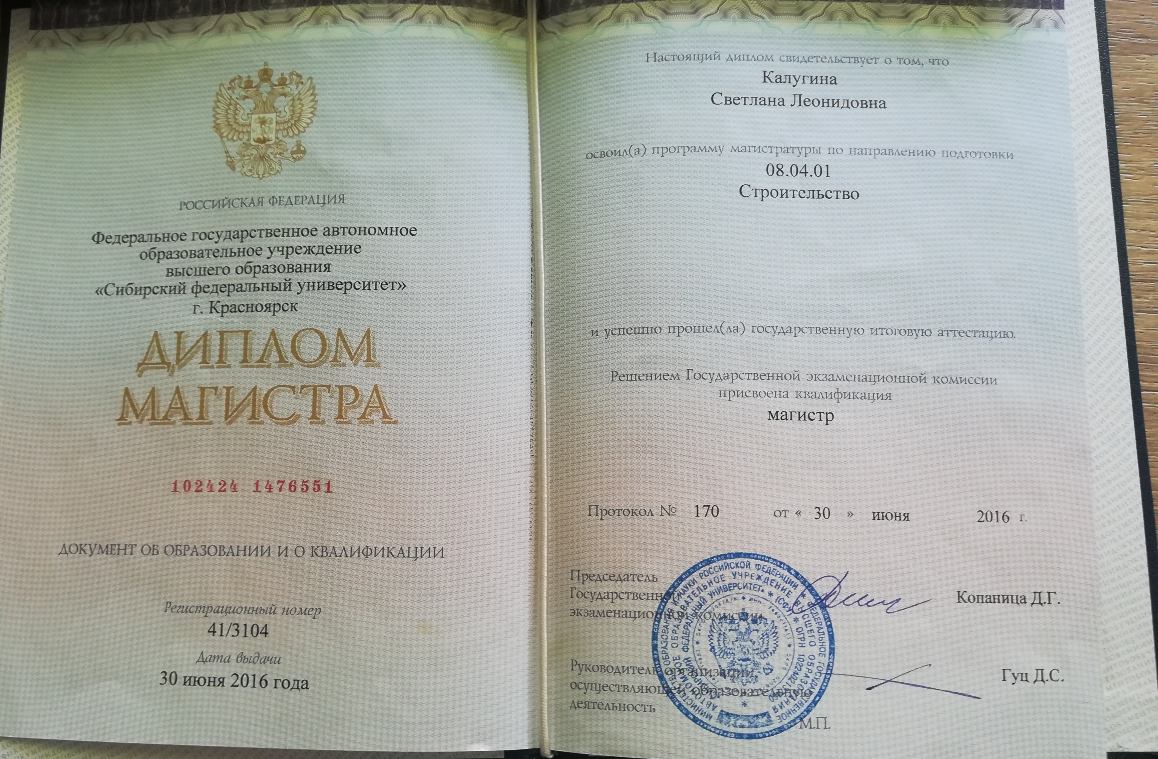 Сибирский Федеральный Университет, Инженерно-Строительный Институт, "Теория и проектирование зданий и сооружений", магистр, 2016 год.