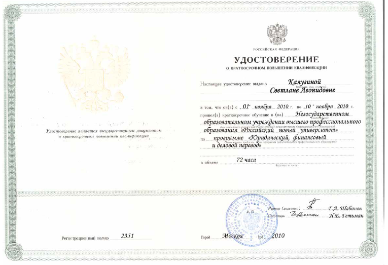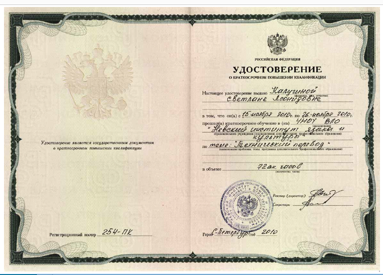 Повышение квалификации: «Синхронный перевод», удостоверение государственного образца (Москва, 2009 год). «Технический перевод», удостоверение государственного образца (Санкт-Петербург, 2010 год). «Юридический, финансовый и деловой перевод», удостоверение государственного образца (Москва, 2010 год)....