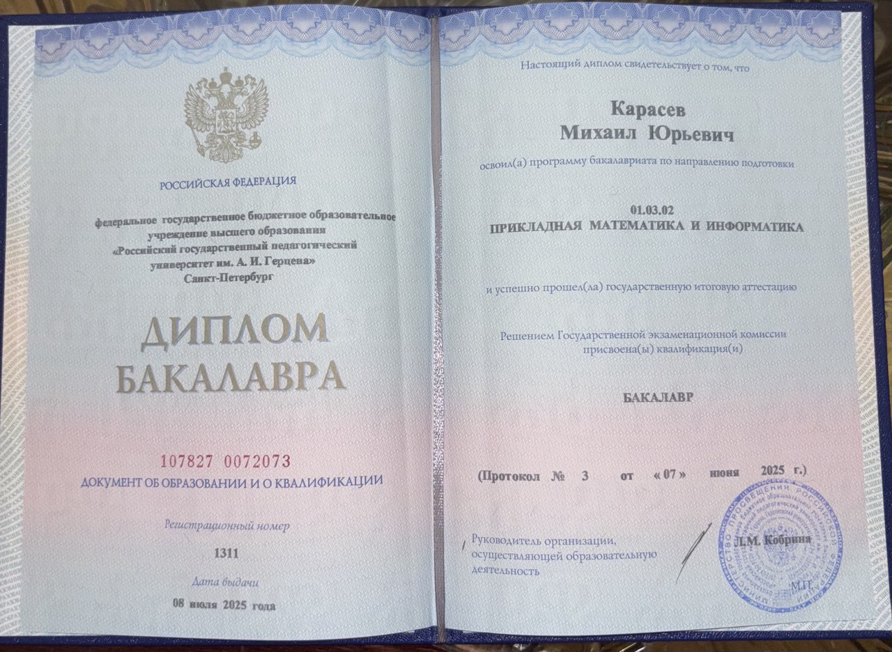 Образование: РГПУ имени А. И. Герцена, факультет математики «Прикладная математика и информатика», бакалавр, 2025 год.