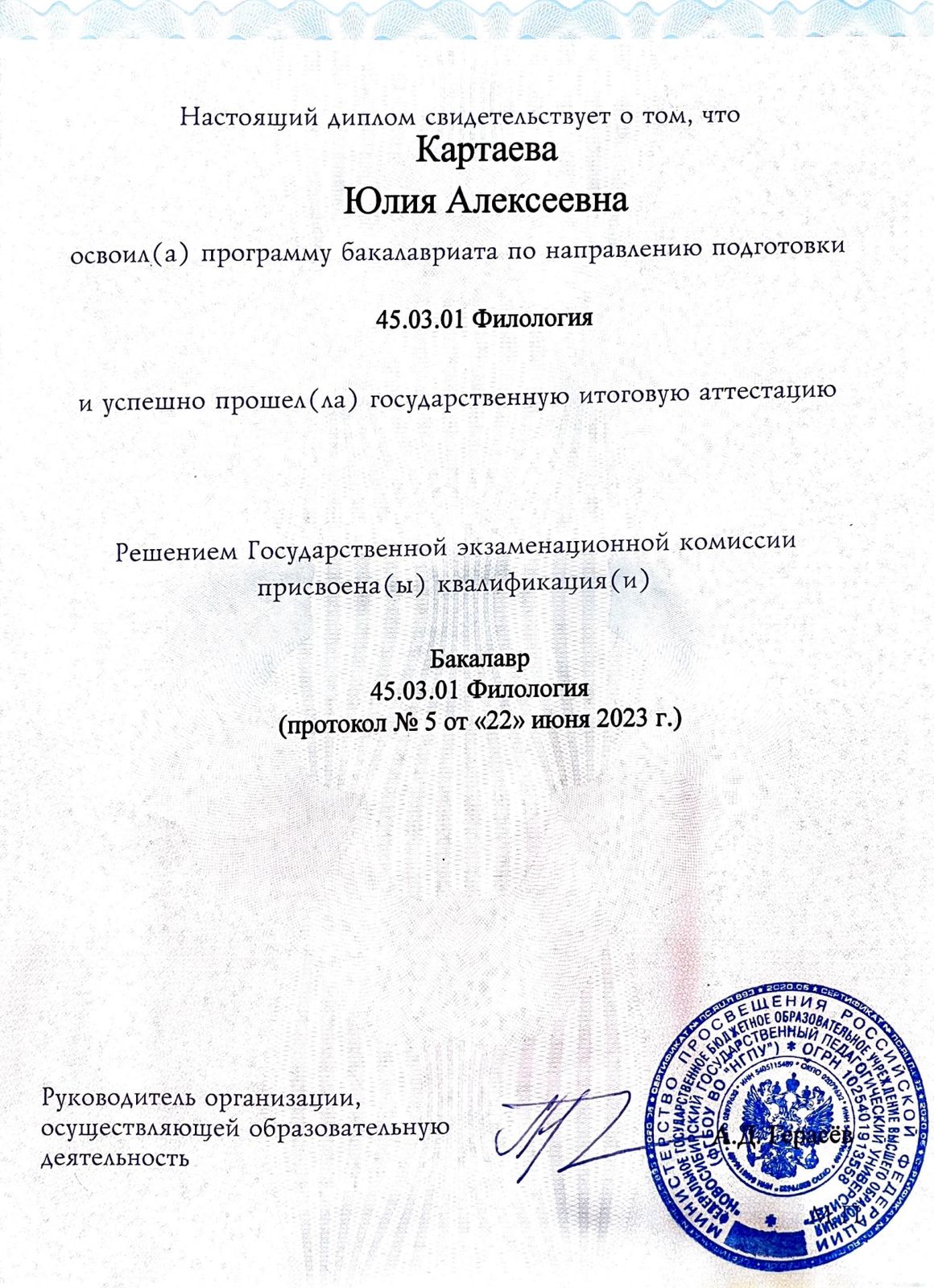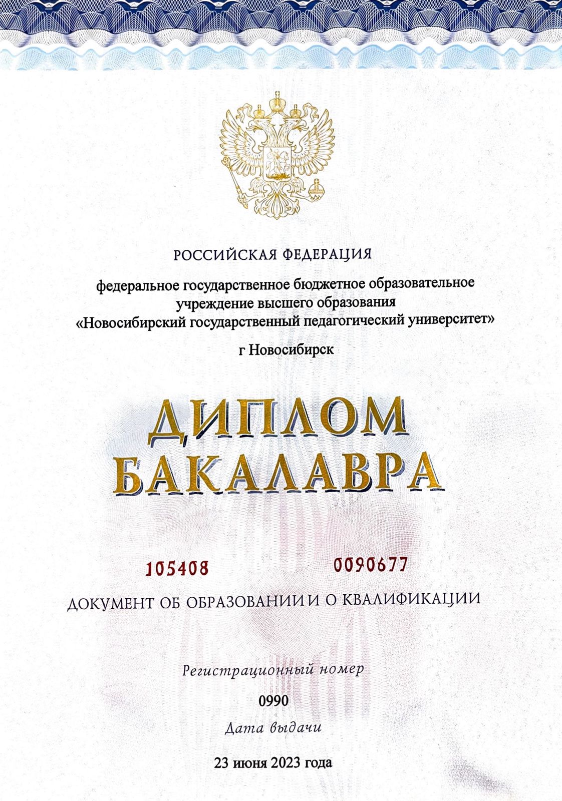 - Образование: Высшее, Новосибирский Государственный Педагогический Университет, филология, бакалавр, 2023 год.