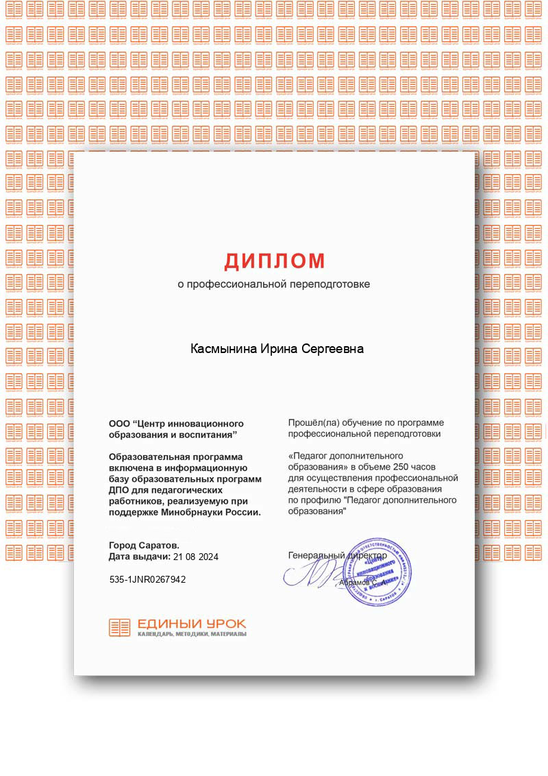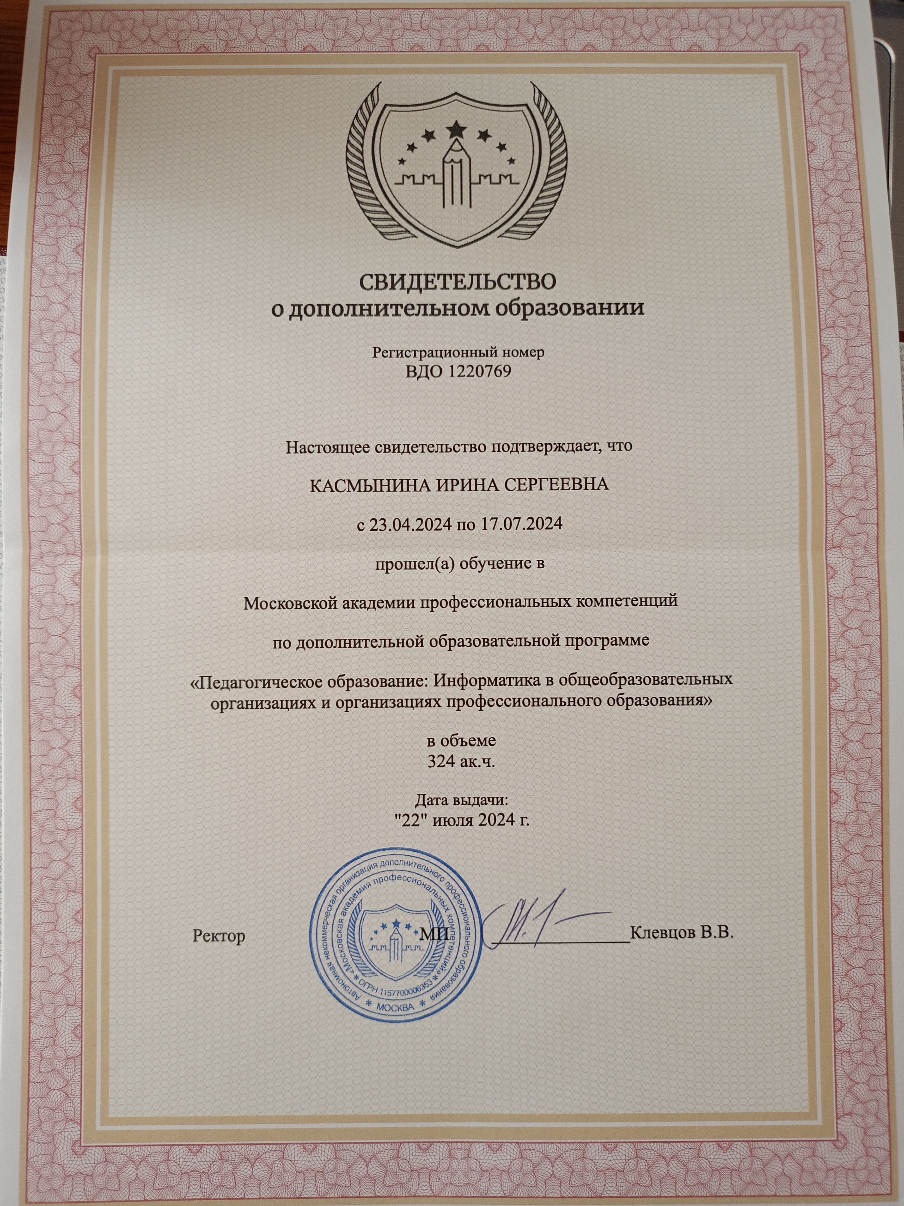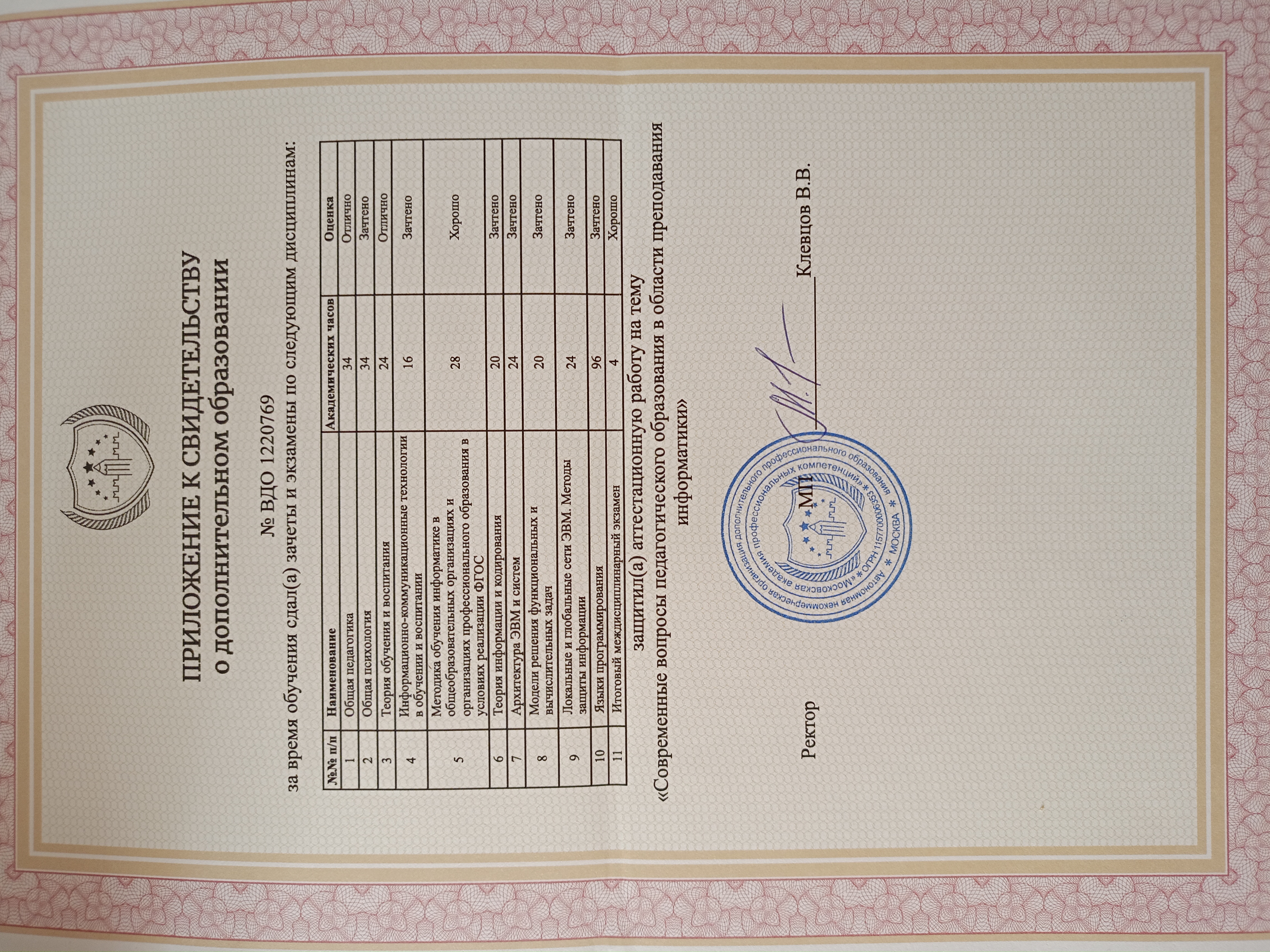 Дополнительная информация: Окончила школу в 2017 году с золотой медалью и сдала ЕГЭ по информатике на 91 балл. Призёр II этапа олимпиад ВСОШ по информатике и математике, прошла на III этап. Владею языками программирования "Python", "Java", "Kotlin". Прошла педагогическую переподготовку.