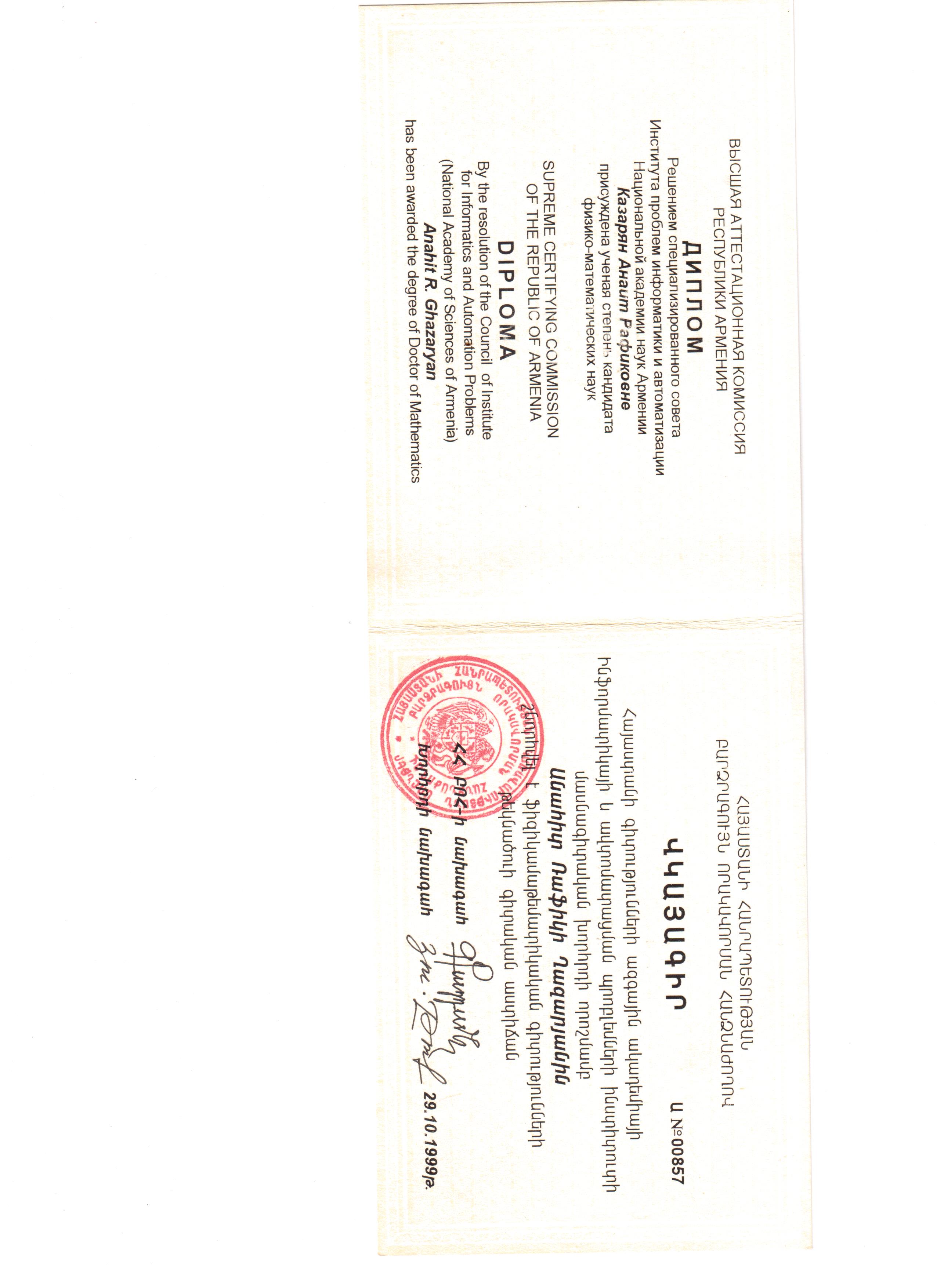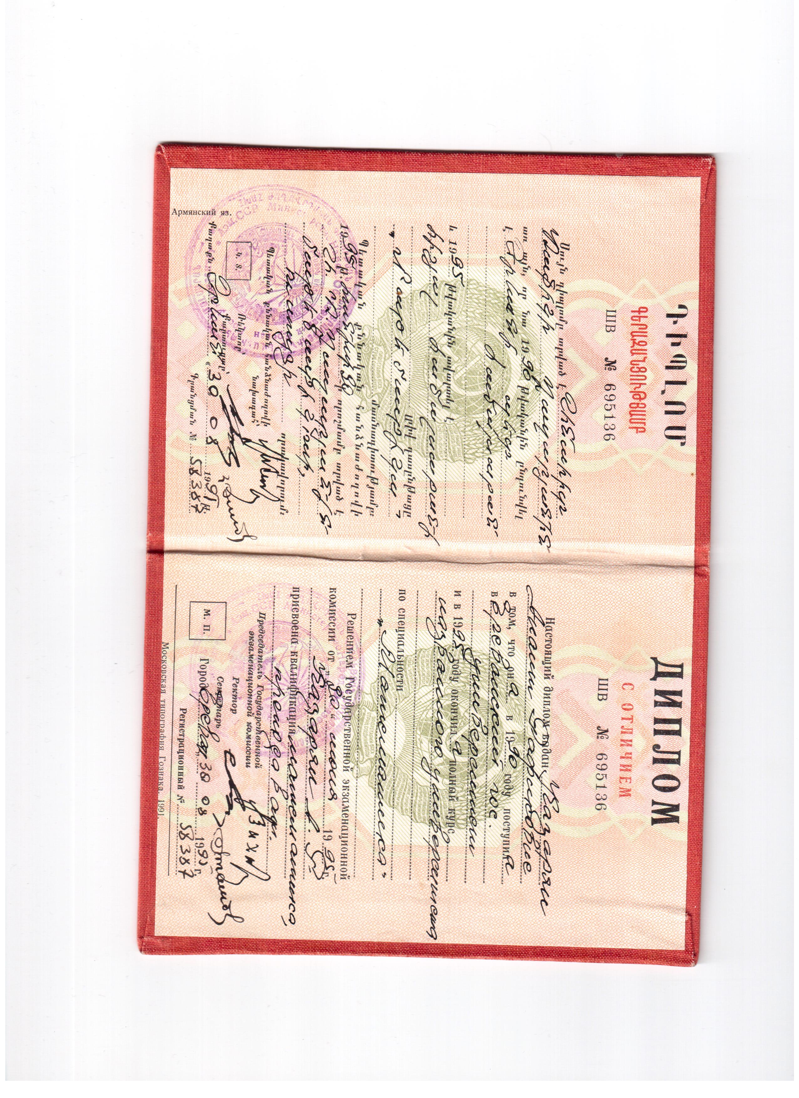 Образование: Ереванский Государственный Университет, математик, преподаватель, диплом с отличием, специалист, 1995 год.