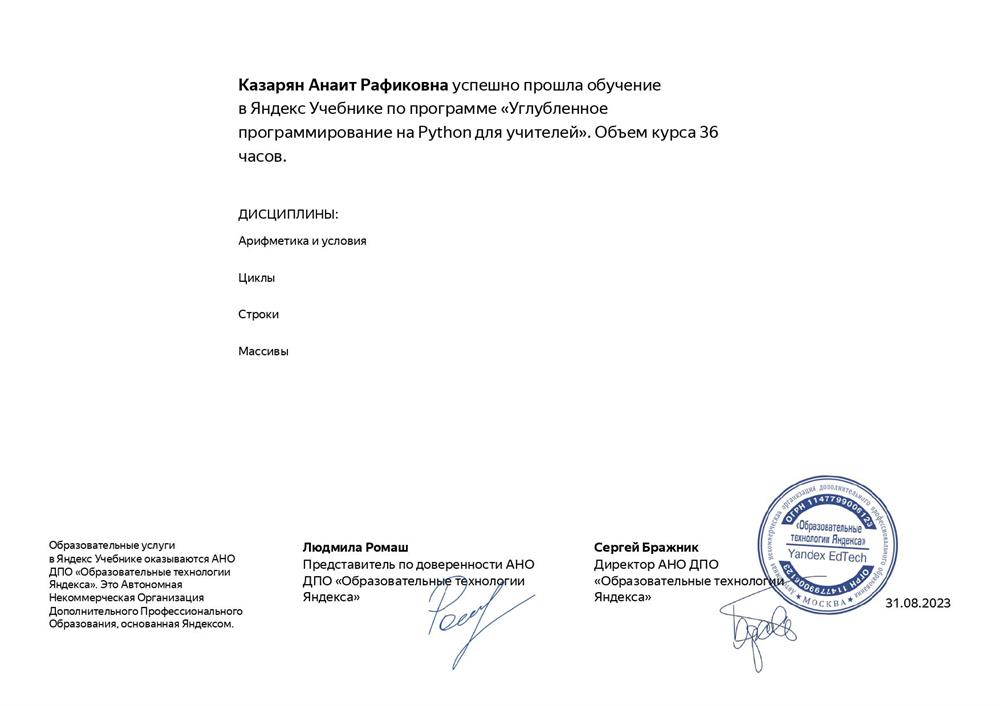 Много лет работала старшим научным сотрудником в Национальной Академии Наук Армении. Являюсь автором многочисленных научных трудов в области теории информации, кодирования и криптографии. Являюсь специалистом с глубокими знаниями теоретических и практических аспектов предмета "Информатика". Имею глубокие знания языков программирования "Python", "Java", "Pascal" и "Basic"....