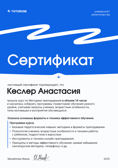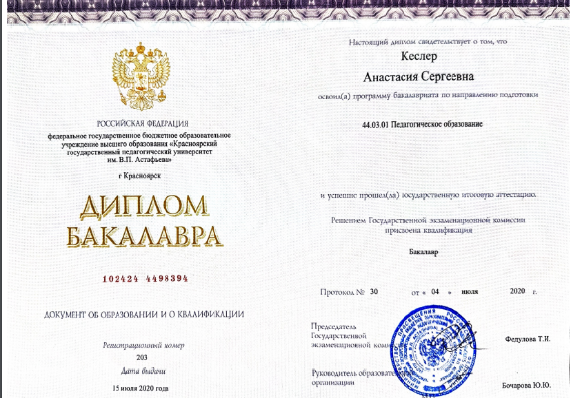 - Образование: Высшее, КГПУ имени В. П. Астафьева, филологический факультет, педагогическое образование (бакалавр 2020 год, магистр 2022 год).