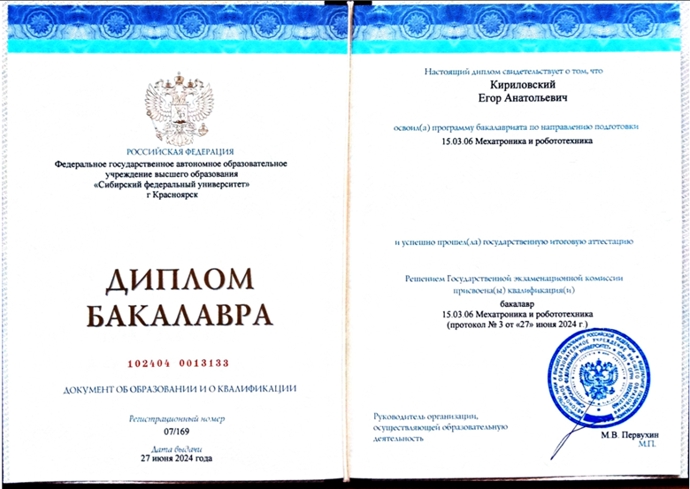 Образование: Сибирский Федеральный Университет, специальность "Мехатроника и робототехника", бакалавр, 2024 год.